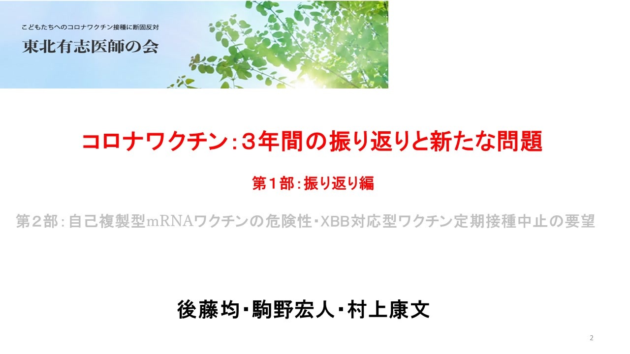 「コロナワクチン 3年間の振り返りと新たな問題 <br>第1部 ~3年間の振り返り~」(投稿日8月23日 公開日9月2日)<br><br>村上康文<br>東京理科大学 名誉教授<br><a href="https://www.yasufumimurakami-official.com" target="_blank" rel="noopener nofollow">https://www.yasufumimurakami-official.com</a><br><br>後藤均(東北有志医師の会 代表)<br>ごとう整形外科 手外科クリニック 院長<br><a href="https://karyukai.jp" target="_blank" rel="noopener nofollow">https://karyukai.jp</a><br><br>駒野宏人(東北有志医師の会)<br>薬学博士、認知症・神経科学専門<br><a href="https://brainfitness-coaching.net" target="_blank" rel="noopener nofollow">https://brainfitness-coaching.net</a><br><br>【チャプター】<br><a href="#" class="seekTime" data-seekTime="0:00" onclick="seekNicoPlayer('#0:00'); return false;">#0:00</a> コロナワクチンの簡単な経緯<br><a href="#" class="seekTime" data-seekTime="7:09" onclick="seekNicoPlayer('#7:09'); return false;">#7:09</a> ①人類史上初めてのmRNAワクチン<br><a href="#" class="seekTime" data-seekTime="24:20" onclick="seekNicoPlayer('#24:20'); return false;">#24:20</a> ②有効性と安全性の検討が不十分<br><a href="#" class="seekTime" data-seekTime="30:45" onclick="seekNicoPlayer('#30:45'); return false;">#30:45</a> ③コロナmRNAワクチンの問題点<br><a href="#" class="seekTime" data-seekTime="42:44" onclick="seekNicoPlayer('#42:44'); return false;">#42:44</a> ④副反応被害・超過死亡数激増の問題<br><a href="#" class="seekTime" data-seekTime="48:31" onclick="seekNicoPlayer('#48:31'); return false;">#48:31</a> ⑤コロナ治療薬<br><a href="#" class="seekTime" data-seekTime="52:15" onclick="seekNicoPlayer('#52:15'); return false;">#52:15</a> ⑥その他の重大な問題<br><a href="#" class="seekTime" data-seekTime="55:28" onclick="seekNicoPlayer('#55:28'); return false;">#55:28</a> ⑦史上最大の薬害<br><br>【第2部はこちら】<br>「コロナワクチン 3年間の振り返りと新たな問題 第2部 ~自己複製型mRNAワクチンの危険性・XBB対応型ワクチン定期接種中止の要望~」<a href="https://www.nicovideo.jp/watch/sm42653151" target="_blank" rel="noopener nofollow">https://www.nicovideo.jp/watch/sm42653151</a><br><br>【ダイジェスト版】「9月20日から開始されるXBB対応型ワクチンの危険性」<a href="https://www.nicovideo.jp/watch/sm42653350" target="_blank" rel="noopener nofollow">https://www.nicovideo.jp/watch/sm42653350</a><br><br><br><東北有志医師の会><br>■ホームページ:<a href="https://tohokuishi.localinfo.jp/" target="_blank" rel="noopener nofollow">https://tohokuishi.localinfo.jp/</a><br>■Twitter:<a href="https://twitter.com/tohokuyushiishi" target="_blank" rel="noopener nofollow">https://twitter.com/tohokuyushiishi</a><br>■Facebook:<a href="https://www.facebook.com/tohokuyushiishi" target="_blank" rel="noopener nofollow">https://www.facebook.com/tohokuyushiishi</a><br>■Instagram:<a href="https://www.instagram.com/tohokuishi/" target="_blank" rel="noopener nofollow">https://www.instagram.com/tohokuishi/</a><br>■ニコニコ動画:<a href="https://www.nicovideo.jp/user/124160257" target="_blank" rel="noopener nofollow">https://www.nicovideo.jp/user/124160257</a><br>■YouTube:<a href="https://www.youtube.com/@user-pj5zm9hb4x" target="_blank" rel="noopener nofollow">https://www.youtube.com/@user-pj5zm9hb4x</a><br>■stand fm:<a href="https://stand.fm/channels/623755237cd..." target="_blank" rel="noopener nofollow">https://stand.fm/channels/623755237cd...</a><br>