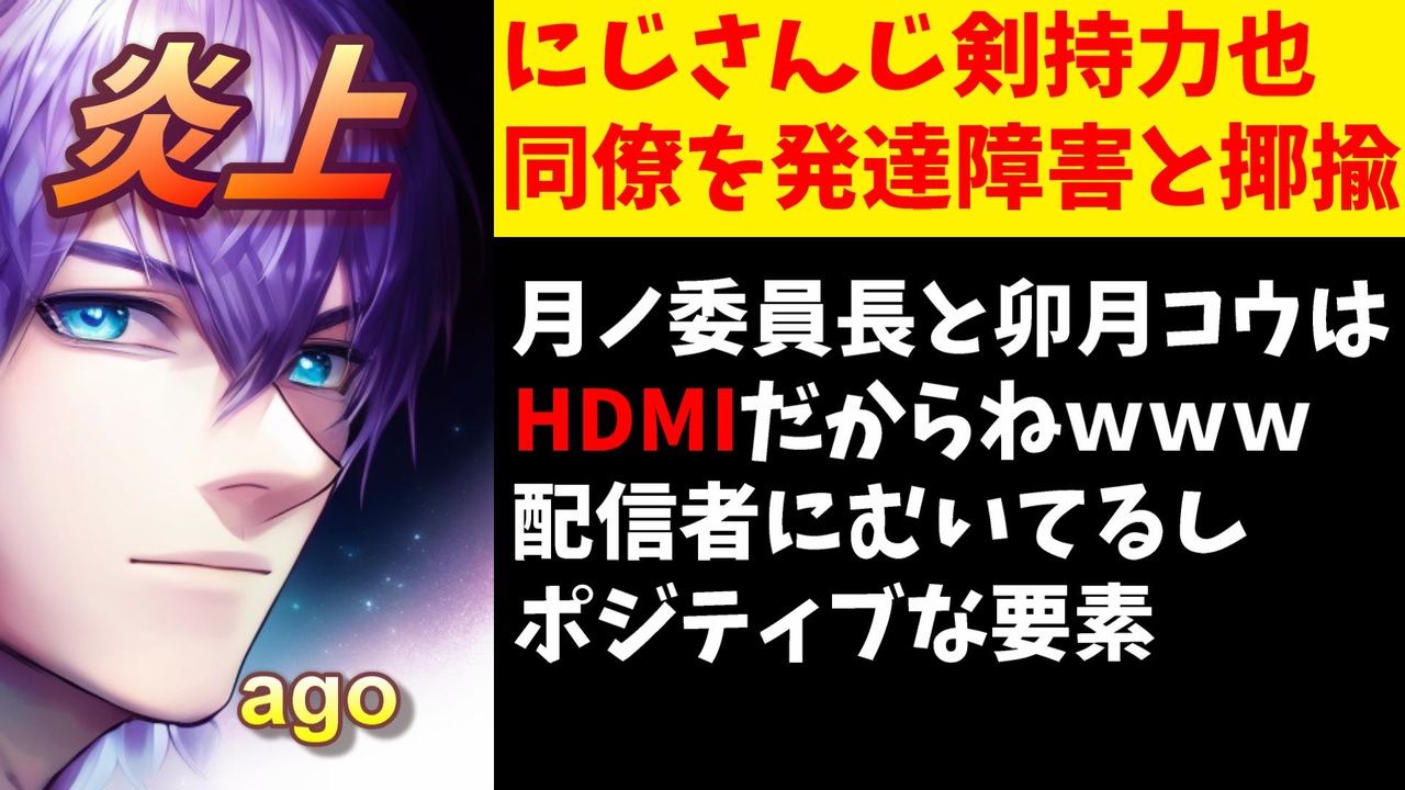 2023年8月23日、にじさんじ所属の剣持刀也さんが同僚の月ノ美兎さんと卯月コウさんに対しHDMI(ADHDを意味するスラング)と何度も揶揄し炎上しています。<br><br>引用<br>【告知アリ】誕生日を迎えた男、剣持刀也<br><a href="https://www.youtube.com/live/gdaWfApTT1U?feature=share" target="_blank" rel="noopener nofollow">https://www.youtube.com/live/gdaWfApTT1U?feature=share</a><br><a href="https://www.vstats.jp/" target="_blank" rel="noopener nofollow">https://www.vstats.jp/</a><br><br>Youtube <a href="https://www.youtube.com/@V_Virgin_Mary" target="_blank" rel="noopener nofollow">https://www.youtube.com/@V_Virgin_Mary</a><br>twitter <a href="https://twitter.com/V_Virgin_Mary" target="_blank" rel="noopener nofollow">https://twitter.com/V_Virgin_Mary</a><br><br>使用素材<br>高品質なフリー動画素材 - Pixabay <a href="https://pixabay.com/ja/videos" target="_blank" rel="noopener nofollow">https://pixabay.com/ja/videos</a>