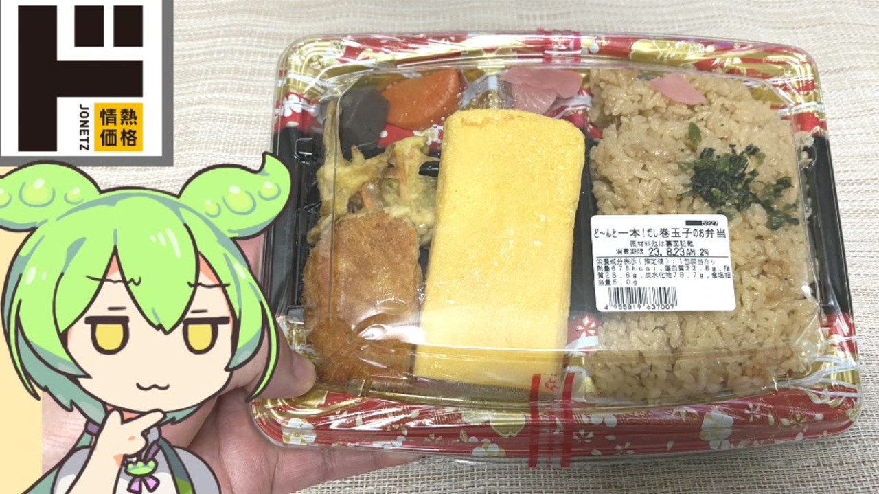 どーんとド真ん中にだし巻き玉子が乗っているドン・キホーテのお弁当です。<br><br><br>【参考】<br>藤本食品株式会社<br><a href="https://www.fujimotofoods.co.jp/index.html" target="_blank" rel="noopener nofollow">https://www.fujimotofoods.co.jp/index.html</a><br>弊社で製造しているローソン100のお弁当がテレビで紹介されました(藤本食品株式会社)<br><a href="https://www.fujimotofoods.co.jp/news/news_content/%E5%BC%8A%E7%A4%BE%E3%81%AE%E3%81%8A%E5%BC%81%E5%BD%93%E3%81%8C%E3%83%86%E3%83%AC%E3%83%93%E3%81%A7%E7%B4%B9%E4%BB%8B%E3%81%95%E3%82%8C%E3%81%BE%E3%81%97%E3%81%9F/" target="_blank" rel="noopener nofollow">https://www.fujimotofoods.co.jp/news/news_content/%E5%BC%8A%E7%A4%BE%E3%81%AE%E3%81%8A%E5%BC%81%E5%BD%93%E3%81%8C%E3%83%86%E3%83%AC%E3%83%93%E3%81%A7%E7%B4%B9%E4%BB%8B%E3%81%95%E3%82%8C%E3%81%BE%E3%81%97%E3%81%9F/</a><br><br><br>【使用した素材】(※敬称略)<br>(合成音声)VOICEVOX/ずんだもん/四国めたん/<br><a href="https://voicevox.hiroshiba.jp/" target="_blank" rel="noopener nofollow">https://voicevox.hiroshiba.jp/</a><br>(立ち絵)坂本アヒル<br><a href="https://seiga.nicovideo.jp/seiga/im10788496" target="_blank" rel="noopener">im10788496</a>/<a href="https://seiga.nicovideo.jp/seiga/im10791276" target="_blank" rel="noopener">im10791276</a><br>(楽曲)甘茶の音楽工房/「楽しい麦畑」<br><a href="https://amachamusic.chagasi.com/" target="_blank" rel="noopener nofollow">https://amachamusic.chagasi.com/</a><br><br><br>【関連動画】<br>ドンキホーテの情熱価格「ミニカカオチョコパイ」<br><a href="https://www.youtube.com/watch?v=czDCaz6d2dA&t=3s" target="_blank" rel="noopener nofollow">https://www.youtube.com/watch?v=czDCaz6d2dA&t=3s</a><br>ドンキホーテの情熱価格とトップバリュの黄色いヤツ「麦茶」<br><a href="https://www.youtube.com/watch?v=9bigfUpPZuk" target="_blank" rel="noopener nofollow">https://www.youtube.com/watch?v=9bigfUpPZuk</a>