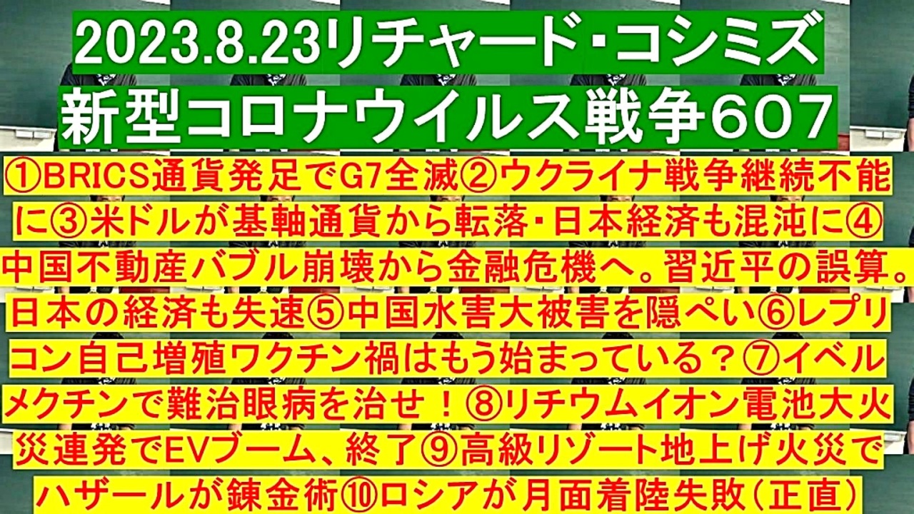 <span style="color: #cc4125;"><strong>「 テーマ : 新型コロナウイルス戦争 607 」</strong></span><br><br><span style="color: #ff0000;"><strong>「 ①.『 BRICS通貨発足 』で『 G7全滅 』 ②.『 ウクライナ戦争継続不能 』に ③.『 米ドル 』が『 基軸<br> 通貨 』から『 転落 』・『 日本経済 』も『 混沌 』に ④.『 中国不動産バブル崩壊 』から『 金融危機 』<br> へ。『 習近平 』の『 誤算 』。『 日本 』の『 経済 』も『 失速 』 ⑤.『 中国水害大被害 』を『 隠ぺい <br> 』 ⑥.『 レプリコン自己増殖ワクチン禍 』は、もう始まっている? ⑦.『 イベルメクチン 』で『 難治眼<br> 病 』を『 治せ 』! ⑧.『 リチウムイオン電池大火災連発 』で、『 EVブーム 』、『 終了 』 ⑨.『 高級<br> リゾート地上げ火災 』で、『 ハザール 』が『 錬金術 』 ⑩.『 ロシア 』が『 月面着陸失敗 』( 正直 )」</strong></span><br><br><span style="color: #0000ff;"><strong>「『 イベルメクチン・アビガン・その他コロナ対策 』について、ご意見をお寄せ下さい! 」<br><br> ◐ E-mail:richardkoshimizu@gmail.com</strong></span><br><br><strong>◐「クリエイター・サポート」・「ニコニ広告」・「フォロー」等、ご協力の程宜しくお願い致します。RK</strong><br><br><span style="color: #38761d;"><strong>◐ リチャード・コシミズ 講演会 公式 動画ギャラリー</strong></span><br> <span style="color: #38761d;"><strong><a href="http://www.t-sskk.com/richardkoshimizu/video-gallery/index.html" target="_blank" rel="noopener nofollow">http://www.t-sskk.com/richardkoshimizu/video-gallery/index.html</a><br><br>◐ リチャード・コシミズ 講演会 「 ニコニコ生放送『 LIVE 』」</strong></span><br> <span style="color: #38761d;"><strong><a href="https://bit.ly/3Bx8F5w" target="_blank" rel="noopener nofollow">https://bit.ly/3Bx8F5w</a></strong></span><br><br>