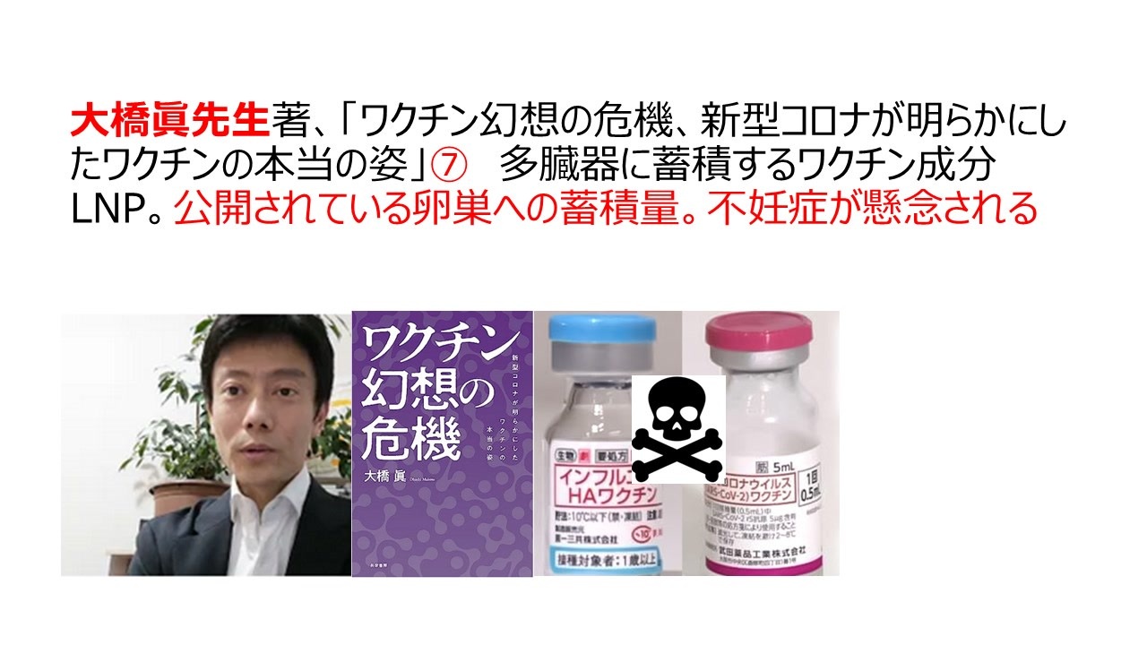 mRNAワクチン添付文書<br><a href="https://www.mhlw.go.jp/content/11123000/000738743.pdf" target="_blank" rel="noopener nofollow">https://www.mhlw.go.jp/content/11123000/000738743.pdf</a><br><br>ワクチン幻想の危機 書籍サイト<br><a href="https://www.amazon.co.jp/dp/B0C7KHFFDX/" target="_blank" rel="noopener nofollow">https://www.amazon.co.jp/dp/B0C7KHFFDX/</a><br>大橋眞先生著、「ワクチン幻想の危機、新型コロナが明らかにしたワクチンの本当の姿」要約 ワクチンの安全性検査に数年かかるのみならず、病原体の特定・証明に数年かかる。コロナウイルスは特定されていない!<br> <a href="https://www.nicovideo.jp/watch/sm42609279" target="_blank" rel="noopener nofollow">https://www.nicovideo.jp/watch/sm42609279</a><br> <br> 大橋眞先生著、「ワクチン幻想の危機、新型コロナが明らかにしたワクチンの本当の姿」① 恐怖洗脳によって作られたコロナ茶番、特定されない病原菌、イカサマPCR、生物兵器ワクチン<br> <a href="https://www.nicovideo.jp/watch/so42613979" target="_blank" rel="noopener nofollow">https://www.nicovideo.jp/watch/so42613979</a><br><br>大橋眞先生著、「ワクチン幻想の危機、新型コロナが明らかにしたワクチンの本当の姿」② 新興感染症の病原体検査はありえない! PCR検査が作り出す利権構造<br><a href="https://www.nicovideo.jp/watch/sm42624183" target="_blank" rel="noopener nofollow">https://www.nicovideo.jp/watch/sm42624183</a><br><br>大橋眞先生著、「ワクチン幻想の危機、新型コロナが明らかにしたワクチンの本当の姿」③ 首相官邸の接種回数表のイカサマ。6回接種済み2千万人が最も危険と推定<br><a href="https://www.nicovideo.jp/watch/sm42628981" target="_blank" rel="noopener nofollow">https://www.nicovideo.jp/watch/sm42628981</a><br><br>大橋眞先生著、「ワクチン幻想の危機、新型コロナが明らかにしたワクチンの本当の姿」④ 人工的な免疫力は無力!ワクチンは病原体の変異を乗り越えられない! 感染症とは何か?<br><a href="https://www.nicovideo.jp/watch/sm42634008" target="_blank" rel="noopener nofollow">https://www.nicovideo.jp/watch/sm42634008</a><br><br>大橋眞先生著、「ワクチン幻想の危機、新型コロナが明らかにしたワクチンの本当の姿」⑤ 適当すぎる臨床試験の判断。承認書類、添付文書には副反応が大量に明記されている<br><a href="https://www.nicovideo.jp/watch/sm42644207" target="_blank" rel="noopener nofollow">https://www.nicovideo.jp/watch/sm42644207</a><br><br>大橋眞先生著、「ワクチン幻想の危機、新型コロナが明らかにしたワクチンの本当の姿」⑥ 変異スピードにも対応できないうえに、多数共存する変異体の把握も不可能<br><a href="https://www.nicovideo.jp/watch/sm42653648" target="_blank" rel="noopener nofollow">https://www.nicovideo.jp/watch/sm42653648</a><br><br>日本国独立宣言論 私は独立を宣言する! 真田信秋<br><a href="https://amzn.to/3D90lwx" target="_blank" rel="noopener nofollow">https://amzn.to/3D90lwx</a>