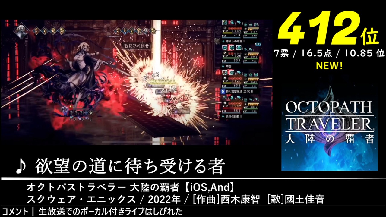 429位~407位の23曲を収録しています。<br>2022年5月1日~8月1日にかけて開催された「第15回みんなで決めるゲーム音楽ベスト100」の結果を動画化したものです。<span style="font-size: 10px;">集計人≠動画制作者</span><br><br><br>↓全体の結果はこちら↓<br><a href="https://w.atwiki.jp/gamemusicbest100/pages/9902.html" target="_blank" rel="noopener nofollow">https://w.atwiki.jp/gamemusicbest100/pages/9902.html</a><br><br><br>※収録時間が5分以上の楽曲です。<br><a href="#" class="seekTime" data-seekTime="14:00" onclick="seekNicoPlayer('#14:00'); return false;">#14:00</a>~、<a href="#" class="seekTime" data-seekTime="27:11" onclick="seekNicoPlayer('#27:11'); return false;">#27:11</a>~、<a href="#" class="seekTime" data-seekTime="38:31" onclick="seekNicoPlayer('#38:31'); return false;">#38:31</a>~、<a href="#" class="seekTime" data-seekTime="63:34" onclick="seekNicoPlayer('#63:34'); return false;">#63:34</a>~<br><br><br>Part.23→<a href="https://www.nicovideo.jp/watch/sm42607103" class="watch">sm42607103</a><br>Part.25→<a href="https://www.nicovideo.jp/watch/sm42701806" class="watch">sm42701806</a><br>第15回まとめ→<a href="https://www.nicovideo.jp/mylist/74713060" target="_blank" rel="noopener">mylist/74713060</a><br><br><br>【ショートカット】<br>429位<a href="#" class="seekTime" data-seekTime="0:40" onclick="seekNicoPlayer('#0:40'); return false;">#0:40</a> / 428位<a href="#" class="seekTime" data-seekTime="3:33" onclick="seekNicoPlayer('#3:33'); return false;">#3:33</a> / 427位<a href="#" class="seekTime" data-seekTime="6:51" onclick="seekNicoPlayer('#6:51'); return false;">#6:51</a> / 426位<a href="#" class="seekTime" data-seekTime="10:24" onclick="seekNicoPlayer('#10:24'); return false;">#10:24</a> / 425位<a href="#" class="seekTime" data-seekTime="12:26" onclick="seekNicoPlayer('#12:26'); return false;">#12:26</a> / 424位<a href="#" class="seekTime" data-seekTime="14:00" onclick="seekNicoPlayer('#14:00'); return false;">#14:00</a> / 423位<a href="#" class="seekTime" data-seekTime="19:59" onclick="seekNicoPlayer('#19:59'); return false;">#19:59</a> / 422位<a href="#" class="seekTime" data-seekTime="24:07" onclick="seekNicoPlayer('#24:07'); return false;">#24:07</a> / 421位<a href="#" class="seekTime" data-seekTime="27:11" onclick="seekNicoPlayer('#27:11'); return false;">#27:11</a> / 420位<a href="#" class="seekTime" data-seekTime="33:05" onclick="seekNicoPlayer('#33:05'); return false;">#33:05</a> / 419位<a href="#" class="seekTime" data-seekTime="35:40" onclick="seekNicoPlayer('#35:40'); return false;">#35:40</a> / 418位<a href="#" class="seekTime" data-seekTime="38:31" onclick="seekNicoPlayer('#38:31'); return false;">#38:31</a> / 417位<a href="#" class="seekTime" data-seekTime="47:12" onclick="seekNicoPlayer('#47:12'); return false;">#47:12</a> / 416位<a href="#" class="seekTime" data-seekTime="49:35" onclick="seekNicoPlayer('#49:35'); return false;">#49:35</a> / 415位<a href="#" class="seekTime" data-seekTime="52:12" onclick="seekNicoPlayer('#52:12'); return false;">#52:12</a> / 414位<a href="#" class="seekTime" data-seekTime="54:02" onclick="seekNicoPlayer('#54:02'); return false;">#54:02</a> / 412位①<a href="#" class="seekTime" data-seekTime="57:31" onclick="seekNicoPlayer('#57:31'); return false;">#57:31</a> / 412位②<a href="#" class="seekTime" data-seekTime="61:14" onclick="seekNicoPlayer('#61:14'); return false;">#61:14</a> / 410位①<a href="#" class="seekTime" data-seekTime="63:34" onclick="seekNicoPlayer('#63:34'); return false;">#63:34</a> / 410位②<a href="#" class="seekTime" data-seekTime="70:12" onclick="seekNicoPlayer('#70:12'); return false;">#70:12</a> / 409位<a href="#" class="seekTime" data-seekTime="72:58" onclick="seekNicoPlayer('#72:58'); return false;">#72:58</a> / 408位<a href="#" class="seekTime" data-seekTime="75:47" onclick="seekNicoPlayer('#75:47'); return false;">#75:47</a> / 407位<a href="#" class="seekTime" data-seekTime="78:26" onclick="seekNicoPlayer('#78:26'); return false;">#78:26</a>