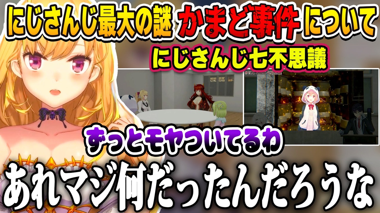 このかまど事件が起きた2019年8月中旬から9月上旬の主な出来事<br><br>・マイクラ初心者エビオが色々暴れまくってバズる<br>・にじさんじランド再建企画<br>・リオン様がエビオの家のスイートベリーでアイテム全ロス事件<br>・エビオの家爆破事件<br>・エビオの家再建築(加賀美インダストリアル)<br><br>とかなり人が多くて賑わってた時期。<br><br>元動画はこちら↓<br>【雑談/talk】朝活成功の世界線、ダウナーな鷹宮とチルい曲(Chill MIX)【にじさんじ/鷹宮リオン】<br><a href="https://www.youtube.com/watch?v=ISCFssFFcyc" target="_blank" rel="noopener nofollow">https://www.youtube.com/watch?v=ISCFssFFcyc</a><br>にじさんじ七不思議【椎名唯華/にじさんじ】<br><a href="https://www.youtube.com/watch?v=DeHH_uJQQE0" target="_blank" rel="noopener nofollow">https://www.youtube.com/watch?v=DeHH_uJQQE0</a><br><br>〇ライバーチャンネル<br>鷹宮リオン / Rion Takamiya<br><a href="https://www.youtube.com/channel/UCV5ZZlLjk5MKGg3L0n0vbzw" target="_blank" rel="noopener nofollow">https://www.youtube.com/channel/UCV5ZZlLjk5MKGg3L0n0vbzw</a><br><br>〇にじさんじ七不思議<br>椎名唯華 / Shiina Yuika<br><a href="https://www.youtube.com/channel/UC_4tXjqecqox5Uc05ncxpxg" target="_blank" rel="noopener nofollow">https://www.youtube.com/channel/UC_4tXjqecqox5Uc05ncxpxg</a><br>剣持刀也<br><a href="https://www.youtube.com/channel/UCv1fFr156jc65EMiLbaLImw" target="_blank" rel="noopener nofollow">https://www.youtube.com/channel/UCv1fFr156jc65EMiLbaLImw</a><br>笹木咲<br><a href="https://www.youtube.com/channel/UCoztvTULBYd3WmStqYeoHcA" target="_blank" rel="noopener nofollow">https://www.youtube.com/channel/UCoztvTULBYd3WmStqYeoHcA</a><br><br><br>