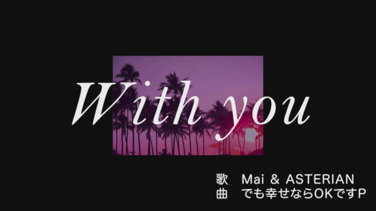 <strong>歌コレ2023秋 グループ部門</strong><br><span style="color: #00ff00;"><strong>24位ありがとうございました!</strong></span><br><strong>カッシーさんとのコラボで参戦です!</strong><br><br>はじめまして!<br>友波透哉と申します!<br>今回はMaji大好きな曲「With you」を<br>大好きなカッシーさんと一緒に大真面目に歌ってみました。<br>二人ともガチで歌ったので、ぜひいっぱいコメントしてください!<br>カッシーさんの歌声が大好きで今回コラボができてGachiで嬉しいです!<br>コラボしてくれて本当にありがとうございます!!!<(_ _)><br><br>‐ 本家様 ‐<br>原曲動画→<a href="https://www.nicovideo.jp/watch/sm41740620" class="watch">sm41740620</a><br>作詞・作曲→でも幸せならOKですP(バーミーズさん)<br>niconico:<a href="https://www.nicovideo.jp/user/118720511" target="_blank" rel="noopener nofollow">https://www.nicovideo.jp/user/118720511</a><br>マイリスト:<a href="https://www.nicovideo.jp/mylist/73084455" target="_blank" rel="noopener nofollow">https://www.nicovideo.jp/mylist/73084455</a><br>Twitter:<a href="https://twitter.com/baminchu" target="_blank" rel="noopener nofollow">https://twitter.com/baminchu</a><br>動画は本家様からお借りしました!<br><br>‐ Vocal ‐<br> ASTERIANパート:カッシーさん<br>niconico:<a href="https://nicovideo.jp/user/76984702" target="_blank" rel="noopener nofollow">https://nicovideo.jp/user/76984702</a><br>Twitter:<a href="https://twitter.com/Kascy4869" target="_blank" rel="noopener nofollow">https://twitter.com/Kascy4869</a><br><br>Maiパート:友波透哉<br>niconico:<a href="https://www.nicovideo.jp/user/95101187" target="_blank" rel="noopener nofollow">https://www.nicovideo.jp/user/95101187</a><br>Twitter:<a href="https://twitter.com/108tomonami" target="_blank" rel="noopener nofollow">https://twitter.com/108tomonami</a><br><br>◇ ◆ ◇ ◆ ◇ ◆ ◇ ◆ ◇ ◆ ◇ ◆ ◇ <br><br>カッシーさん・スラさん・ReNさん・shokomoさん・Kyoichiさん・ちくわぶさん・凛音さん・バッテンネコさん・シオザキミナトさん・Co-ichiさん・miki-Uさん・あきぼんぼさん・かばやきさん・MLさん・Take-hiさん・HABAさん・C.Makotoさん・ピロッシーさん・Xerokina:ゼロキナさん・Sound PaPa Pさん・べぺさん<br><br>沢山の広告ありがとうございます!<br><br>いいね、コメント、マイリス本当にありがとうございます!!!<br><br>◇ ◆ ◇ ◆ ◇ ◆ ◇ ◆ ◇ ◆ ◇ ◆ ◇ <br><br>※カッシーさん経由で本家様に歌コレ参加許可いただきました!<br>許可・そしてギフトしていただきありがとうございます!