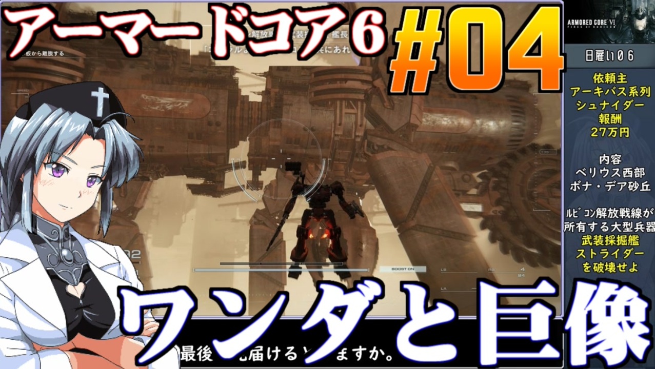 初ワンダと巨像なので初投稿です。<br>日雇いその06.ルビコン解放戦線の移動採掘艦「ストライダー」破壊<br><br>◆アーマードコア6◆<br>1997年にフロムソフトウェアから発売されたハイスピードメカアクション<br>メカパーツの組み換えで戦場を戦い抜く愛機を作る<br>本作は2023年8月25日に発売されたARMOREDCOREⅥのsteam版。<br>桜乃そら実況動画<br><br>◆ニコニコクリエイターサポート<br><a href="https://creator-support.nicovideo.jp/registration/1203831" target="_blank" rel="noopener nofollow">https://creator-support.nicovideo.jp/registration/1203831</a><br>動画制作の励みになります<br><br>◆Twitter<br><a href="https://twitter.com/ikamono8bit" target="_blank" rel="noopener nofollow">https://twitter.com/ikamono8bit</a><br>◆youtube<br><a href="http://www.youtube.com/c/IkamonoY" target="_blank" rel="noopener nofollow">http://www.youtube.com/c/IkamonoY</a><br><br>シリーズまとめ <a href="https://www.nicovideo.jp/user/1203831/series" target="_blank" rel="noopener nofollow">https://www.nicovideo.jp/user/1203831/series</a><br>作った動画全部 <a href="https://www.nicovideo.jp/mylist/42963985" target="_blank" rel="noopener">mylist/42963985</a><br>作った動画全部2<a href="https://www.nicovideo.jp/mylist/70404393" target="_blank" rel="noopener">mylist/70404393</a>