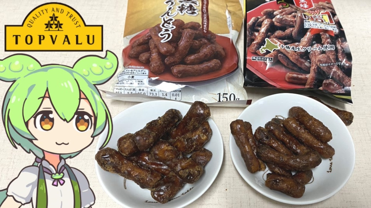 黒糖かりんとうです。<br><br><br>【参考】<br>米油で三度揚げし、黒蜜の風味豊かな黒糖かりんとう(トップバリュ)<br><a href="https://www.topvalu.net/items/detail/4549414004533/" target="_blank" rel="noopener nofollow">https://www.topvalu.net/items/detail/4549414004533/</a><br>株式会社 夏目製菓<br><a href="http://kknatume.sakura.ne.jp/index.html" target="_blank" rel="noopener nofollow">http://kknatume.sakura.ne.jp/index.html</a><br>東京カリント<br><a href="https://www.tokyokarinto.co.jp/" target="_blank" rel="noopener nofollow">https://www.tokyokarinto.co.jp/</a><br><br><br>【使用した素材】(※敬称略)<br>(合成音声)VOICEVOX/ずんだもん/四国めたん/<br><a href="https://voicevox.hiroshiba.jp/" target="_blank" rel="noopener nofollow">https://voicevox.hiroshiba.jp/</a><br>(立ち絵)坂本アヒル<br><a href="https://seiga.nicovideo.jp/seiga/im10788496" target="_blank" rel="noopener">im10788496</a>/<a href="https://seiga.nicovideo.jp/seiga/im10791276" target="_blank" rel="noopener">im10791276</a><br>(楽曲)甘茶の音楽工房/「楽しい麦畑」<br><a href="https://amachamusic.chagasi.com/" target="_blank" rel="noopener nofollow">https://amachamusic.chagasi.com/</a>