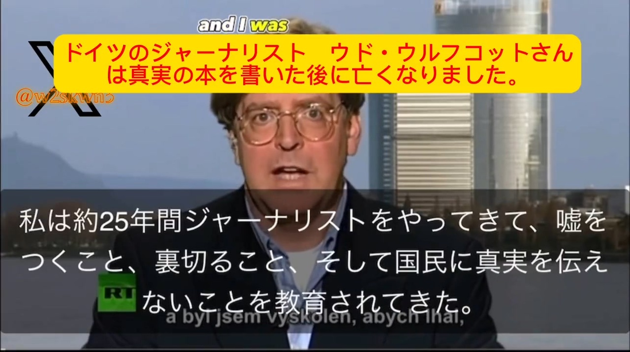 元の動画→ <a href="https://twitter.com/i/status/1695912489450709275" target="_blank" rel="noopener nofollow">https://twitter.com/i/status/1695912489450709275</a><br>少し9分と動画長いんですが、元ドイツのジャーナリストだったウド・ウルフコットさんの暴露を是非広めてほしいと思い載せました。彼はこの告白の直後に死亡<br>。<br>「25年間ジャーナリストをしてきた。私は嘘をつき、大衆にプロパガンダを伝え真実を語らないように教育をされてきた。多くの著名なジャーナリストの中にも私と同じようにCIA、秘密結社、世界の億万長者から報酬を受け取ってCIAから原稿を渡されサインだけしろと命令され人々を操作するのに使われている。」<br><br>原稿までCIAが書いてるとは凄い事実でびっくりしました。<br>沢山のジャーナリストきっと亡くなっているんだろーな。酷いですね。<br><br><br><a href="https://twitter.com/w2skwn3" target="_blank" rel="noopener nofollow">https://twitter.com/w2skwn3</a><br>トッポ<br>@w2skwn3<br>趣味は国際政治ですが大学では医学を学びました。テレビの嘘報道にはうんざりしてツイッターで情報交換したいです。<br><br><br> ニコニコ広告ありがとうございます<br>