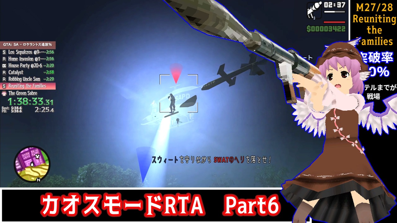 無事最終回です<br>ここまで見ていただきありがとうございました<br><br>fu兄貴におかわりを頂いてしまいました!⇒ <a href="https://seiga.nicovideo.jp/seiga/im11260759" target="_blank" rel="noopener">im11260759</a><br>flathead兄貴にクールな二人を描いていただきました!⇒ <a href="https://seiga.nicovideo.jp/seiga/im11271329" target="_blank" rel="noopener">im11271329</a><br>-----------------------------------------------------------------------------------------------<br>前作(100%) ⇒ <a href="https://www.nicovideo.jp/watch/sm40054826" class="watch">sm40054826</a><br>前々作(Any%)⇒ <a href="https://www.nicovideo.jp/watch/sm38193800" class="watch">sm38193800</a><br>レ違作(NMG)⇒ <a href="https://www.nicovideo.jp/watch/sm35682411" class="watch">sm35682411</a><br><br>Part1 ⇒ <a href="https://www.nicovideo.jp/watch/sm42668640" class="watch">sm42668640</a><br><br>Part5 ⇒ <a href="https://www.nicovideo.jp/watch/sm42687278" class="watch">sm42687278</a><br><br>全部 ⇒ <a href="https://www.nicovideo.jp/mylist/66485665" target="_blank" rel="noopener">mylist/66485665</a><br>-----------------------------------------------------------------------------------------------<br>Q.RTAの環境を知りたい!<br><br>A.通常のRTAであれば Speedrun.com GTASAページのGuidesとResourcesで<br> 必要な情報が集まります <a href="https://www.speedrun.com/gtasa" target="_blank" rel="noopener nofollow">https://www.speedrun.com/gtasa</a><br> Guidesにある解説動画でダウングレード等のやり方が紹介されています<br> ゲームのバージョンは1.01が主流になります<br><br> 今回のカオスRTA環境ということであればバージョンはMod使用に最適な1.0<br> ダウングレードや日本語化についてはGTASA完全日本語化@ウィキ <a href="https://w.atwiki.jp/gtasajp" target="_blank" rel="noopener nofollow">https://w.atwiki.jp/gtasajp</a><br> にて詳しいやり方が掲載されています<br> 今回の動画で使用したModはPart1概要欄に書いたものがすべてです