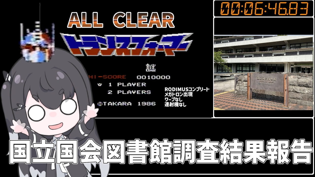 また国会図書館へ行ってきました。<br>今回は前回よりは収穫が少ないかも。<br>それでも、伝聞で聞いていた当時の情報を実際の資料を読んで確認する作業は、研究において大事なことだと思います。<br>もっとも、最近はコンボイの謎で遊んだ結果、重大な発見が続いているため、文献研究がおろそかになってしまっているのですが。<br><br><span style="font-size: 10px;">動画の最後にも言いましたが、「ファミ通の読者投稿クソゲーランキング」が掲載されている号を探しております。画像を見た限り、1994年までに発売されたゲームを対象としていたようです。該当の号をご存じの方はコメントを残していただければ幸いです。</span><br><span style="font-size: 18px;">※2023/09/03追記<br>複数の方からファミ通のクソゲーランキングの該当雑誌の情報をいただきました。次回調査に活かさせていただきます。ご協力いただきましてありがとうございました。<br><br>現在ファミコン40周年記念サイトにて「「謎」といえば」というテーマで投票が行われています。ぜひコンボイの謎に投票しましょう。</span><br>※2023/09/07追記<br>2位でした。みなさまご協力ありがとうございました。アトランチスの謎1位おめでとうございます。<br><br><a href="https://www.nintendo.com/jp/famicom/vote/index.html" target="_blank" rel="noopener nofollow">https://www.nintendo.com/jp/famicom/vote/index.html</a><br><br>カテゴリ:1周目RODIMUSコンプリート、メガトロン出現、ワープなし。<br> 2周目滅び/Damnation<br>連射機なし。<br><br>無編集動画:<a href="https://www.youtube.com/watch?v=yhIGzp4wEpw" target="_blank" rel="noopener nofollow">https://www.youtube.com/watch?v=yhIGzp4wEpw</a><br> <br>完全攻略動画:<a href="https://www.nicovideo.jp/watch/sm41549759" class="watch">sm41549759</a><br><br>怪現象集:<a href="https://www.nicovideo.jp/watch/sm41545650" class="watch">sm41545650</a><br><br>ボイスはCoeFontミリアルさんとアリアルさんを使用させて頂きました。<br>Voiced by <a href="https://CoeFont.cloud" target="_blank" rel="noopener nofollow">https://CoeFont.cloud</a><br><br>立ち絵:梓音しのん様<br>ちんまいアリミリ姉妹立ち絵<br><a href="https://seiga.nicovideo.jp/seiga/im11025058" target="_blank" rel="noopener nofollow">https://seiga.nicovideo.jp/seiga/im11025058</a>
