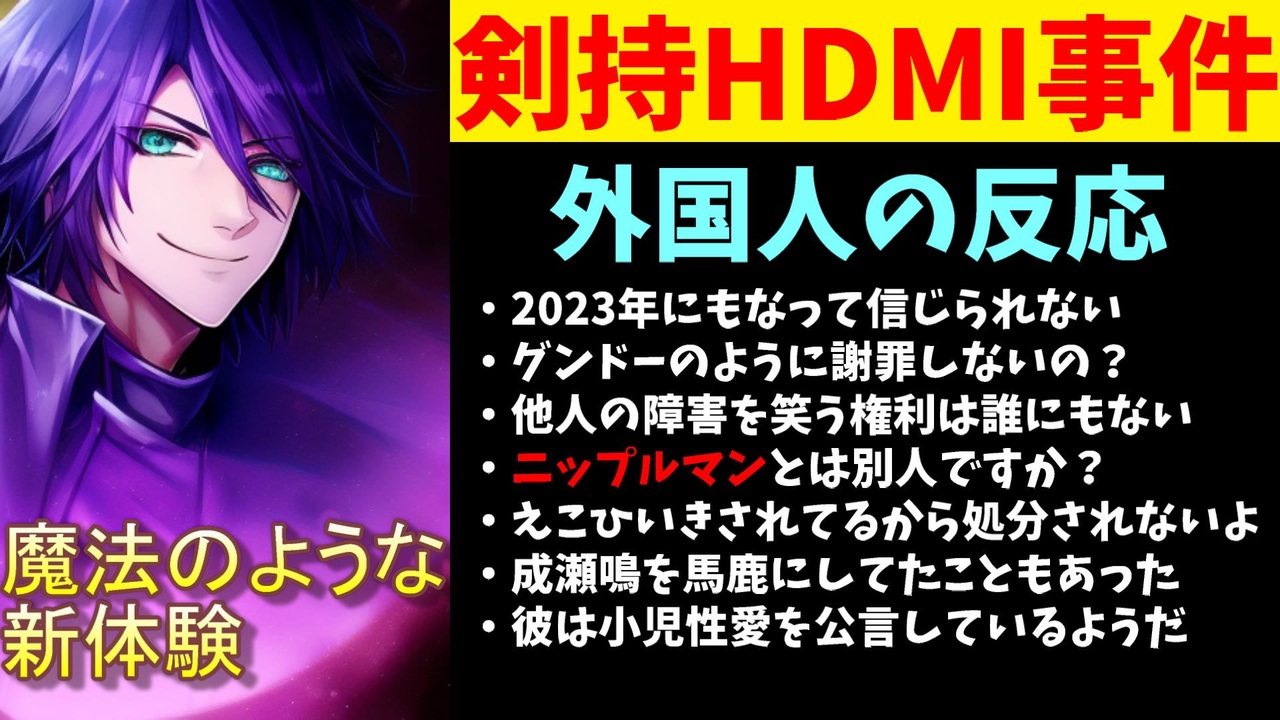 2023年8月23日、にじさんじ所属の剣持刀也さんが同僚の月ノ美兎さんと卯月コウさんに対しHDMI(ADHDを意味するスラング)と何度も揶揄し炎上していたけんが31日に北米最大のアニメニュースメディアに報道されてたようです。<br><br>引用<br><a href="https://www.animenewsnetwork.com/interest/2023-08-30/nijisanji-youtuber-kenmochi-toya-jokes-about-fellow-streamers-having-adhd/.201732" target="_blank" rel="noopener nofollow">https://www.animenewsnetwork.com/interest/2023-08-30/nijisanji-youtuber-kenmochi-toya-jokes-about-fellow-streamers-having-adhd/.201732</a><br><a href="https://boards-4channel-org.translate.goog/vt/thread/57420960?_x_tr_sl=auto&_x_tr_tl=ja&_x_tr_hl=ja" target="_blank" rel="noopener nofollow">https://boards-4channel-org.translate.goog/vt/thread/57420960?_x_tr_sl=auto&_x_tr_tl=ja&_x_tr_hl=ja</a><br><br>Youtube <a href="https://www.youtube.com/@V_Virgin_Mary" target="_blank" rel="noopener nofollow">https://www.youtube.com/@V_Virgin_Mary</a><br>twitter <a href="https://twitter.com/V_Virgin_Mary" target="_blank" rel="noopener nofollow">https://twitter.com/V_Virgin_Mary</a><br><br>使用素材<br>高品質なフリー動画素材 - Pixabay <a href="https://pixabay.com/ja/videos" target="_blank" rel="noopener nofollow">https://pixabay.com/ja/videos</a>