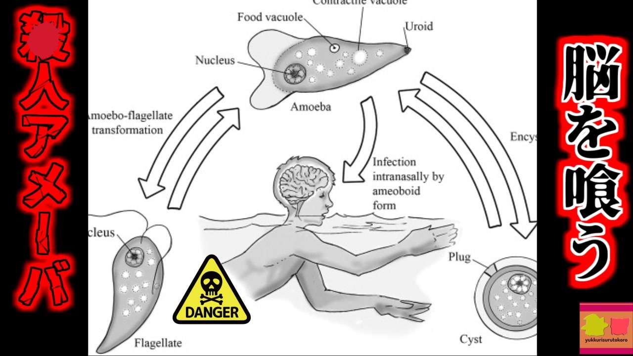 <a href="#" class="seekTime" data-seekTime="00:00" onclick="seekNicoPlayer('#00:00'); return false;">#00:00</a> 冒頭挨拶<br><a href="#" class="seekTime" data-seekTime="00:24" onclick="seekNicoPlayer('#00:24'); return false;">#00:24</a> 視聴上の注意<br><a href="#" class="seekTime" data-seekTime="00:53" onclick="seekNicoPlayer('#00:53'); return false;">#00:53</a> 本編開始<br><a href="#" class="seekTime" data-seekTime="1:37" onclick="seekNicoPlayer('#1:37'); return false;">#1:37</a> 家族で天然温泉に遊びに来たAさん<br><a href="#" class="seekTime" data-seekTime="2:18" onclick="seekNicoPlayer('#2:18'); return false;">#2:18</a> 異変<br><a href="#" class="seekTime" data-seekTime="2:57" onclick="seekNicoPlayer('#2:57'); return false;">#2:57</a> インフルエンザ?<br><a href="#" class="seekTime" data-seekTime="3:24" onclick="seekNicoPlayer('#3:24'); return false;">#3:24</a> MRI検査の結果…<br><a href="#" class="seekTime" data-seekTime="3:54" onclick="seekNicoPlayer('#3:54'); return false;">#3:54</a> 「ネグレリア・フォーレリ」<br><a href="#" class="seekTime" data-seekTime="5:21" onclick="seekNicoPlayer('#5:21'); return false;">#5:21</a> 鼻から脳に寄生<br><a href="#" class="seekTime" data-seekTime="6:10" onclick="seekNicoPlayer('#6:10'); return false;">#6:10</a> 感染すればまず助からない<br><a href="#" class="seekTime" data-seekTime="6:47" onclick="seekNicoPlayer('#6:47'); return false;">#6:47</a> 日本の場合は?<br><a href="#" class="seekTime" data-seekTime="7:13" onclick="seekNicoPlayer('#7:13'); return false;">#7:13</a> 日本が安全だと考えられる理由<br><br><br>今回紹介するのは、アメリカの河川で発生した、珍しい病気の事例です。<br>ネバダ州「アッシュスプリングス」という場所ではこの日、天然温泉で遊ぶ、一組の家族が居ました。<br>同地域に暮らす男性「Aさん」は、妻と2歳の息子を連れ、休日を利用して、この天然温泉で水遊びをし、その後帰宅しましたが、それから約一週間後。息子に風邪に似た症状が現れ、自宅で看病を行っていましたが、それはよくなるどころか悪化し、高熱がでて食事も厳しい状態になってしまいました。<br>インフルエンザを疑ったAさんは、息子を病院に連れていき、医師の診察が行われました。<br>ですが、この時の検査では原因がわからず、医師はAさんに、「何らかの感染症の可能性がありますが、ここ最近何か変わったことをしませんでしたか?」と聞き取りを行い、原因の推測を行いました。<br>その後、脳の検査を行うと、驚きの事実が判明。<br>なんと、息子の脳はとある恐ろしいアメーバに侵食され、その組織を食べられてしまっていたのです。<br><br><br>引用・出展・参考文献<br>Wikipedia Naegleria fowleri<br><a href="https://ishort.ink/vwUY" target="_blank" rel="noopener nofollow">https://ishort.ink/vwUY</a><br>MSDマニュアル アメーバによる脳感染症:原発性アメーバ性髄膜脳炎<br><a href="https://ishort.ink/UYJh" target="_blank" rel="noopener nofollow">https://ishort.ink/UYJh</a><br><br />※この動画は過去の事件を知り、現在でも同じことが発生する危険性を再認識、関与しないように促すための動画であり、視聴者を扇動、動揺を誘うためのコンテンツではありません。<br><br>ご要望にお応えして、メンバーシップの開設を行いました。<br>下記URLからも登録可能ですので、ご興味がある方は是非ご参加ください。<br><a href="https://www.youtube.com/channel/UCcT5a1J7XJW7CLYI2RKl4pw/join" target="_blank" rel="noopener nofollow">https://www.youtube.com/channel/UCcT5a1J7XJW7CLYI2RKl4pw/join</a><br><br><br>Twitter<br>→<a href="https://twitter.com/yukkurisurutoko" target="_blank" rel="noopener nofollow">https://twitter.com/yukkurisurutoko</a><br><br>取り急ぎ、簡易的にですがマイリストを作りました。<br>【ゆっくり解説】事故・事件関係紹介リスト <br><a href="https://www.nicovideo.jp/mylist/71034319" target="_blank" rel="noopener nofollow">https://www.nicovideo.jp/mylist/71034319</a><br>【ゆっくり解説】放射線系事故<br><a href="https://www.nicovideo.jp/mylist/71034368" target="_blank" rel="noopener nofollow">https://www.nicovideo.jp/mylist/71034368</a><br>【ゆっくり解説】鉄道系事故・事件関連<br><a href="https://www.nicovideo.jp/mylist/71034379" target="_blank" rel="noopener nofollow">https://www.nicovideo.jp/mylist/71034379</a>
