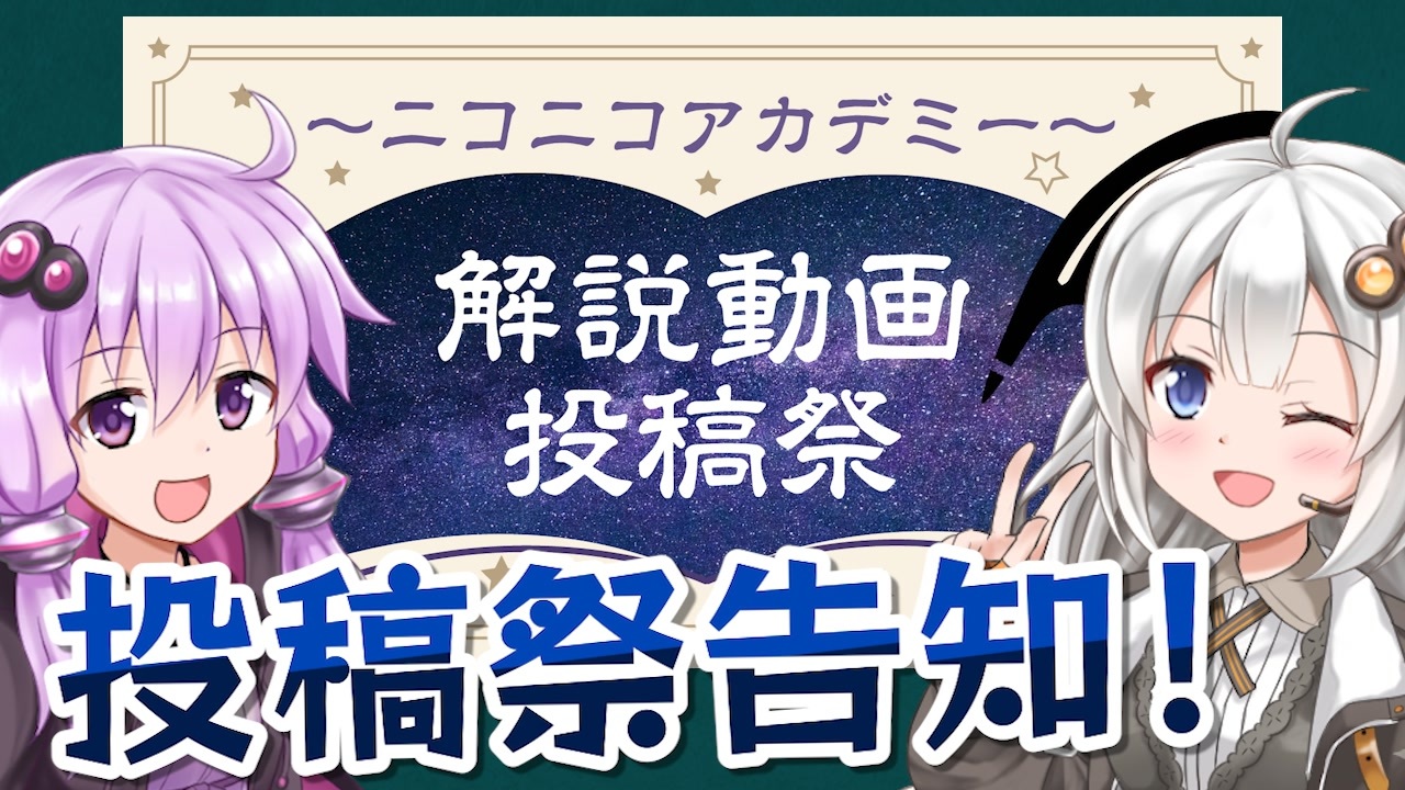 【概要】<br>「解説動画投稿祭~ニコニコアカデミー~」は、ジャンルを問わない解説動画のお祭りです。<br>「ニコニコ動画講座」「ゆっくり解説」「VOICEROID解説」など、さまざまな事柄を解説している動画を対象とした投稿祭です。<br>4月に行われたニコニコ超会議の超ふにんがすステージ「ふにんがすマニアッククイズ大会」の優勝賞品「やりたい番組企画叶えます券」から生まれた企画(主催:いわし@超ビビリ)です。<br><br>■開催期間<br>11月3日(金)0:00~11月5日(日)23:59<br>■参加方法<br>以下の2種類のタグを付与&ロック。<br>①「解説動画投稿祭」をタグ付与&ロック<br>②「解説動画投稿祭_文系」「解説動画投稿祭_理系」「解説動画投稿祭_交通系」「解説動画投稿祭_自由形」の中から1つを選んでタグ付与&タグロック<br><br>■レギュレーション(参加条件)<br>・ご自身が「これは解説動画」だと思う動画であること<br>・ご自身が投稿する権利をお持ちの動画であること<br>・ニコニコ動画に初お披露目の動画であること(過去動画の再投稿不可)<br>・ニコニコ動画のガイドラインを遵守している動画であること<br><br>★詳細は以下のURLから、ニコニコ動画公式の案内をご覧ください。<br><a href="https://blog.nicovideo.jp/niconews/202077.html" target="_blank" rel="noopener nofollow">https://blog.nicovideo.jp/niconews/202077.html</a><br><br><br>使用ソフト<br>A.I.Voice<br>VoiceroidUtil<br>Adobe Premiere Pro<br>2DActorTools<br><br><br><a target="_blank" href="https://qa.nicovideo.jp/faq/show/19424?site_domain=default" style="font-size: 13px;color: #657586; text-decoration: underline; line-height: 1.4">この動画は投稿者によって修正されました</a>