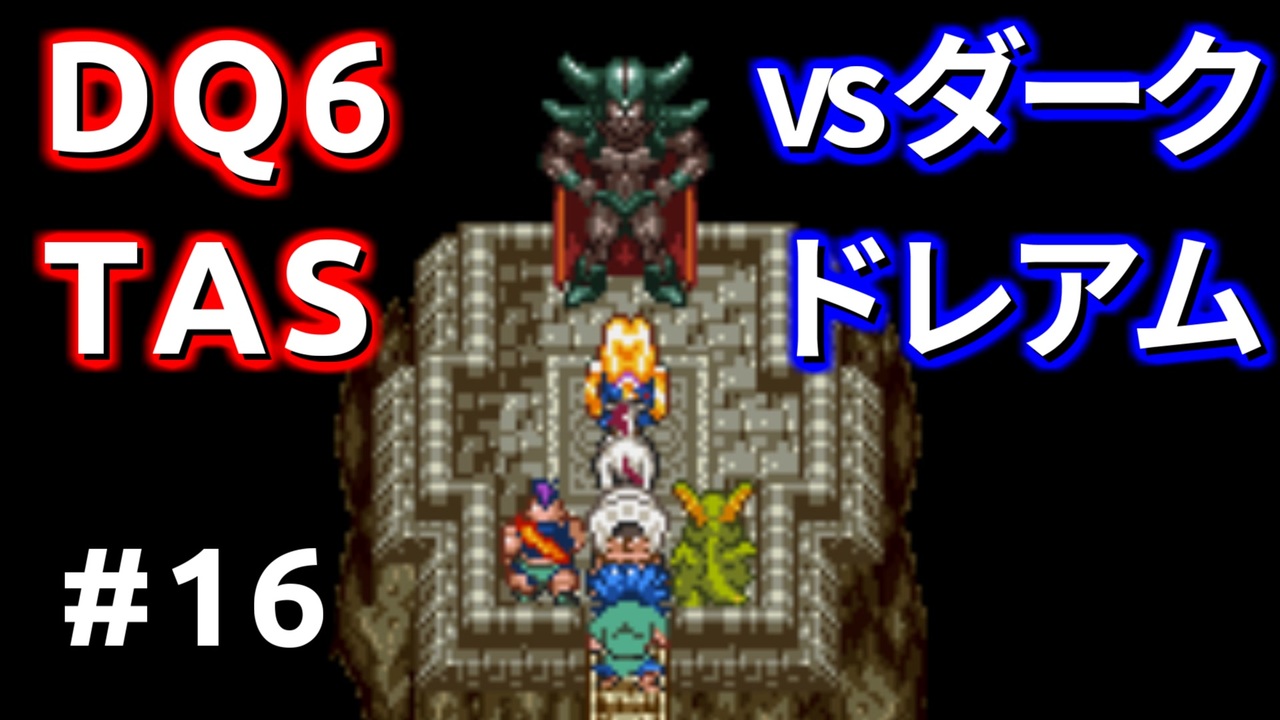 SFC版 DQ6 最速でダークドレアムを倒します。<br>Part16はダークドレアム撃破まで<br><br><a href="https://www.nicovideo.jp/watch/sm42613654" class="watch">sm42613654</a>←前|次→<a href="https://www.nicovideo.jp/watch/sm42726188" class="watch">sm42726188</a><br>part1:<a href="https://www.nicovideo.jp/watch/sm40986223" class="watch">sm40986223</a><br><br>Youtubeにも投稿してます。<br><a href="https://youtu.be/IVgAQbikM40" target="_blank" rel="noopener nofollow">https://youtu.be/IVgAQbikM40</a><br><br>無編集版はこちら<br><a href="https://youtu.be/52rvn-czb3Y" target="_blank" rel="noopener nofollow">https://youtu.be/52rvn-czb3Y</a><br><br>【DQ6】TASさんが無気力でラスボスを倒します↓<br><a href="https://www.nicovideo.jp/series/341945" target="_blank" rel="noopener nofollow">https://www.nicovideo.jp/series/341945</a><br><br>Twitter:<a href="https://twitter.com/eikyudai" target="_blank" rel="noopener nofollow">https://twitter.com/eikyudai</a><br><br>Emulator: Bizhawk (var2.8)<br><br>ネタばれあり<br>この動画で利用している株式会社スクウェア・エニックスを代表とする共同著作者が権利を所有する著作物及びスギヤマ工房有限会社が権利を所有する楽曲の転載・配布は禁止いたします。 © 1995 ARMOR PROJECT/BIRD STUDIO/HEART BEAT/SQUARE ENIX All Rights Reserved. © SUGIYAMA KOBO<br><br>こちらご支援いただけますと製作の時間が増え、投稿の頻度が上がるかもしれません。<br>干芋:<a href="https://t.co/LmZcPKuU6b" target="_blank" rel="noopener nofollow">https://t.co/LmZcPKuU6b</a><br>BASEBREAD:<a href="https://t.co/YcyrogoOrn" target="_blank" rel="noopener nofollow">https://t.co/YcyrogoOrn</a><br>