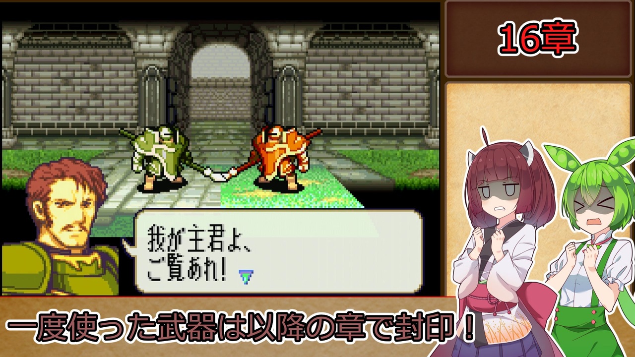 <span style="color: #85200c; font-size: 24px;"><strong><i>主人公3人、遂に集結!!</i></strong></span><br><br><strong>ルール1:一度使用した武器種は、以降の章で使用する事を禁止する。<br>ルール2:武器の使用の定義は『その武器を装備した状態で敵との戦闘が発生したタイミング』『その武器を売却して換金した場合』杖の場合は『対象に対して使用した時点(命中の可否は問わない)』とする。</strong><br><span style="color: #ff0000;"><strong>※同盟軍、演出による戦闘イベントでは使用した判定にはならないこととする。</strong></span><br><strong>ルール3:難易度はリン編ハード→ヘクトル編ハードとする。<br>ルール4:序章から終章まで外伝、異伝を含む全ての章を攻略し、仲間に出来るユニットは全員加入させ、生存させる。(序章と1章のみ同一の章として扱う)</strong><br><span style="color: #ff0000; font-size: 18px;"><strong>※バグ技禁止</strong></span><br><br>本動画のシリーズリスト【<a href="https://www.nicovideo.jp/series/406473" target="_blank" rel="noopener">series/406473</a>】<br>前作の同縛りプレイ【<a href="https://www.nicovideo.jp/series/316824" target="_blank" rel="noopener">series/316824</a>】<br>前:【<a href="https://www.nicovideo.jp/watch/sm42641596" class="watch">sm42641596</a>】次:【<a href="https://www.nicovideo.jp/watch/sm42746445" class="watch">sm42746445</a>】<br><br><strong>使用したソフト</strong><br>VOICEROID+東北きりたんEX<br>VOICEPEAK 東北きりたん<br>VOICEPEAK ずんだもん<br><strong>お借りした素材</strong><br>ニコニコモンズの皆様(コンテンツツリー参照)