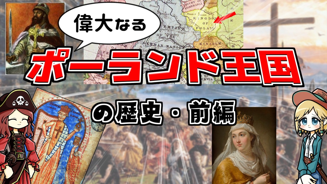ポーランドの歴史っていうとだいたい近代史ですよね。<br>領土を分割され、戦車に踏みしだかれ、国民は蹂躙される…<br>ああ悲劇の国家ポーランド。<br><br>じゃあポーランドはずっといじめられっ子だったのか?<br>そうではありません。むしろ歴史的にはつよつよのつよでした。<br><br>周辺民族はひれ伏し、北はバルト海、南は黒海に広がり、神聖ローマ帝国もキエフ大公国とも対等に渡り合い、他国による占領を許したことなどありゃーせん。<br><br>今回はそんなポーランドのお話です。<br>中編→<a href="https://www.nicovideo.jp/watch/sm42777994?ref=garage_share_other" target="_blank" rel="noopener nofollow">https://www.nicovideo.jp/watch/sm42777994?ref=garage_share_other</a><br><br>☆ファンアートありがとうございました☆<br>ゆたさんのアカウント↓↓↓<br>Twitter (X) → <a href="https://twitter.com/yuta_pp" target="_blank" rel="noopener nofollow">https://twitter.com/yuta_pp</a><br><br>限定動画アリのモンド・ヒストリカの離宮↓<br><a href="https://ch.nicovideo.jp/mond-historica" target="_blank" rel="noopener nofollow">https://ch.nicovideo.jp/mond-historica</a><br><br><br><br>今回の参考文献:<br>伊東一郎 編(2023)『スラヴ民族の歴史』山川出版社 <br>渡辺克善(2017)『物語 ポーランドの歴史』中央公論社 <br>山内進(2011)『北の十字軍 「ヨーロッパ」の北方拡大』講談社 <br>池谷文夫 (2019)『神聖ローマ帝国 ドイツ王が支配した帝国』刀水書房 <br>菊池良生(2003)『神聖ローマ帝国』講談社 → <a href="https://amzn.to/45udZn7" target="_blank" rel="noopener nofollow">https://amzn.to/45udZn7</a><br>菊池良生(2022)『ドイツ誕生 神聖ローマ帝国初代皇帝オットー1世』講談社 <br>高橋理(2013)『ハンザ「同盟」の歴史』創元社 <br><br>その他 Wikipediaなど<br><br>twitter | <a href="https://twitter.com/Yukkuri_mond" target="_blank" rel="noopener nofollow">https://twitter.com/Yukkuri_mond</a><br />━━━━━━━━━━━━━━━━━━━━━<br><br>この動画はクリエイティブ・コモンズ継承(CC-BY-SA)ライセンスの素材を使用して制作しています。(<a href="https://creativecommons.org/licenses/by-sa/4.0/)" target="_blank" rel="noopener nofollow">https://creativecommons.org/licenses/by-sa/4.0/)</a><br>規約に基づき、この動画もCC-BY-SA 4.0 のもとで公開します。<br><br>投稿者共通情報☆彡<br><br>BGM, SE:ニコニ・コモンズ様<br><a href="http://commons.nicovideo.jp/" target="_blank" rel="noopener nofollow">http://commons.nicovideo.jp/</a><br>魔王魂様<br><a href="https://maoudamashii.jokersounds.com/" target="_blank" rel="noopener nofollow">https://maoudamashii.jokersounds.com/</a><br>Audiostock様<br><a href="https://audiostock.jp/" target="_blank" rel="noopener nofollow">https://audiostock.jp/</a><br><br>立ち絵 霊夢・魔理沙(黒子式):nicotalk様<br><a href="http://www.nicotalk.com/charasozai.html" target="_blank" rel="noopener nofollow">http://www.nicotalk.com/charasozai.html</a><br><br>立ち絵 パトラ、マリー、アン、メアリ:ライフライフ様<br><a href="https://0801lifelife.tumblr.com/" target="_blank" rel="noopener nofollow">https://0801lifelife.tumblr.com/</a><br><br>使用ツール1:ゆっくりムービーメーカー4<br><a href="https://manjubox.net/ymm4/" target="_blank" rel="noopener nofollow">https://manjubox.net/ymm4/</a><br><br>使用ツール2:AviUtl<br><a href="http://spring-fragrance.mints.ne.jp/aviutl/" target="_blank" rel="noopener nofollow">http://spring-fragrance.mints.ne.jp/aviutl/</a><br><br>各時代の地図 : World History Maps & Timelines <br><a href="http://geacron.com/home-en/" target="_blank" rel="noopener nofollow">http://geacron.com/home-en/</a><br><br>ゆっくりボイスについて:AquesTalkライセンス取得済み<br><br>キャラクターボイス<br>アン・ボニー:羽ノ華(A.I.VOICE)<br>メアリ・リード:琴葉 葵(A.I.VOICE)<br>クレオパトラ:結月ゆかり(VOICEROID2)<br>マリー‐アントワネット:東北きりたん (VOICEROID EX)<br>その他キャラ:青山龍星(A.I.VOICE)、伊織弓鶴(A.I.VOICE2)、栗田まろん(A.I.VOICE)、宮舞モカ(VOICEPEAK)、フリモメン(VOICEPEAK)<br><br><br><br>その他フリー素材ご提供元の皆様に圧倒的感謝<br>