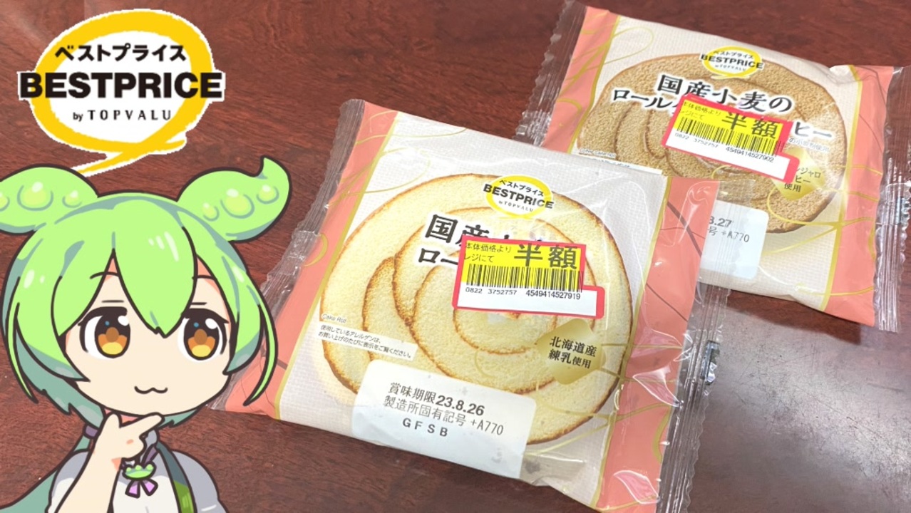 半額になって山積みされてました。<br><br><br>【参考】<br>国産小麦のロールケーキ(トップバリュ)<br><a href="https://www.topvalu.net/items/detail/4549414527919/" target="_blank" rel="noopener nofollow">https://www.topvalu.net/items/detail/4549414527919/</a><br>国産小麦のロールケーキ コーヒー(トップバリュ)<br><a href="https://www.topvalu.net/items/detail/4549414527902/" target="_blank" rel="noopener nofollow">https://www.topvalu.net/items/detail/4549414527902/</a><br>神戸屋<br><a href="https://www.kobeya.co.jp/" target="_blank" rel="noopener nofollow">https://www.kobeya.co.jp/</a><br>5つに切ったロールケーキ(山崎製パン)<br><a href="https://www.yamazakipan.co.jp/product/04/5cut-roll-vanilla.html" target="_blank" rel="noopener nofollow">https://www.yamazakipan.co.jp/product/04/5cut-roll-vanilla.html</a><br><br><br><br>【使用した素材】(※敬称略)<br>(合成音声)VOICEVOX/ずんだもん/四国めたん/<br><a href="https://voicevox.hiroshiba.jp/" target="_blank" rel="noopener nofollow">https://voicevox.hiroshiba.jp/</a><br>(立ち絵)坂本アヒル<br><a href="https://seiga.nicovideo.jp/seiga/im10788496" target="_blank" rel="noopener">im10788496</a>/<a href="https://seiga.nicovideo.jp/seiga/im10791276" target="_blank" rel="noopener">im10791276</a><br>(楽曲)甘茶の音楽工房/「楽しい麦畑」「お城の舞踏会」<br><a href="https://amachamusic.chagasi.com/" target="_blank" rel="noopener nofollow">https://amachamusic.chagasi.com/</a><br><br>
