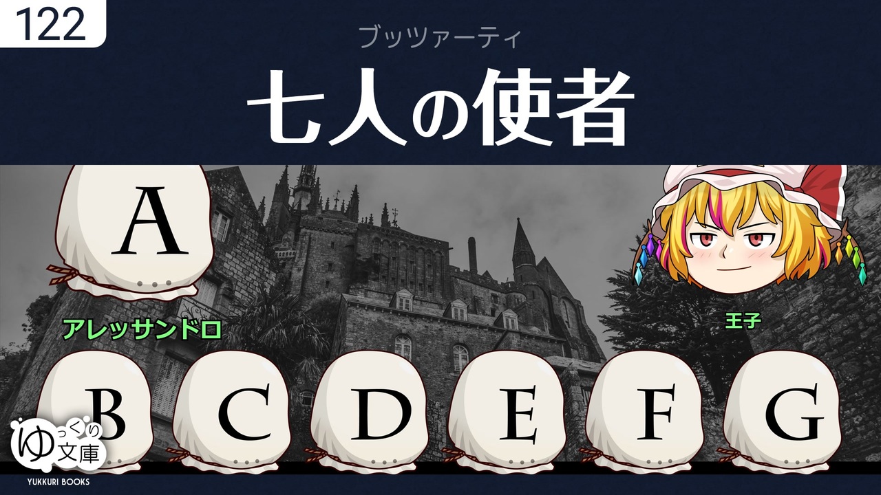 <span style="color: red;"><strong>122 前へ! 前へ!──</strong></span><br>とある国の王子が《国境》を目指して旅に出た。七人の使者が王子と都のあいだを往復するが、その距離は途方もなく広がっていった。<br><span style="color: green;">I sette messaggeri (1942) by Dino Buzzati</span><br><br><span style="font-size: 18px;">第2版:<a href="https://youtu.be/Ee7ohF-SRJw" target="_blank" rel="noopener nofollow">https://youtu.be/Ee7ohF-SRJw</a></span><br><br>【ゆっくり文庫】10周年記念ベストエピソード総選挙<br>投票サイト:<a href="https://forms.gle/JvhawevygFr2SkYb7" target="_blank" rel="noopener nofollow">https://forms.gle/JvhawevygFr2SkYb7</a><br>告知動画 <a href="https://www.nicovideo.jp/watch/sm42700434" class="watch">sm42700434</a><br>イベント運営Xアカウント:<a href="https://twitter.com/Bunko_10th" target="_blank" rel="noopener nofollow">https://twitter.com/Bunko_10th</a><br><br>編集後記や言い訳は生放送で。<br>文庫ラジオ放送局:co5782398<br><br>●ゆっくり文庫について<br>全部:<a href="https://www.nicovideo.jp/mylist/74874627" target="_blank" rel="noopener">mylist/74874627</a><br>近況:<a href="https://twitter.com/trynext" target="_blank" rel="noopener nofollow">https://twitter.com/trynext</a><br>---<br><br><br><br><a target="_blank" href="https://qa.nicovideo.jp/faq/show/19424?site_domain=default" style="font-size: 13px;color: #657586; text-decoration: underline; line-height: 1.4">この動画は投稿者によって修正されました</a>
