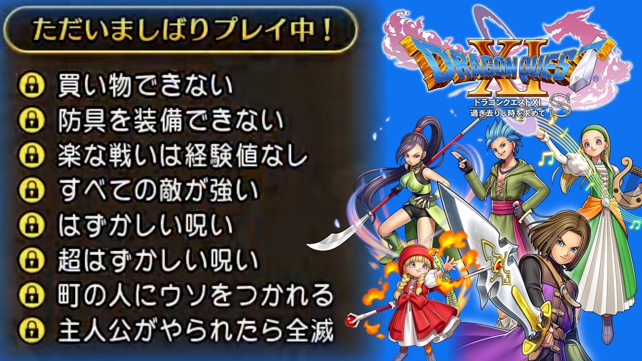 ドラクエ11Sで全ての公式縛りを付けた状態でのRTA<br>計測区間は「冒険の書をつくる」から「やっつけた!」の表示まで<br>ネタバレありです、悪しからず<br><br>最近DQIXの記録狙い配信をよくやってるので、ぜひ見に来てください<br><br>縛り一覧<br>1.買い物できない<br>2.防具を装備できない<br>3.楽な戦いは経験値なし<br>4.すべての敵が強い<br>5.はずかしい呪い<br>6.超はずかしい呪い<br>7.町の人にウソをつかれる<br>8.主人公がやられたら全滅<br><br>ロードリムーバー導入方法→<a href="http://tushirta.livedoor.blog/archives/11966593.html" target="_blank" rel="noopener nofollow">http://tushirta.livedoor.blog/archives/11966593.html</a><br><br>part1→これ<br>次→シリーズからよろしく、概要欄の一番下にあるよ<br>これのマイリス→<a href="https://www.nicovideo.jp/mylist/75697386" target="_blank" rel="noopener">mylist/75697386</a><br>無編集垂れ流し→<a href="https://youtu.be/m_flHmUQCt4" target="_blank" rel="noopener nofollow">https://youtu.be/m_flHmUQCt4</a><br>うp動画まとめ→<a href="https://www.nicovideo.jp/mylist/71230916" target="_blank" rel="noopener">mylist/71230916</a><br><br>タイマースタート~いたずらデビル戦まで<br><br>※この動画の一部または全部を外部サイト等へ転載することを禁じます。<br> 動画紹介等で動画の一部を引用するのは構いません。<br><br>この動画で利用している株式会社スクウェア・エニックスを代表とする共同著作者が権利を所有する著作物及びスギヤマ工房有限会社が権利を所有する楽曲の転載・配布は禁止いたします。<br>(C) ARMOR PROJECT/BIRD STUDIO/SQUARE ENIX All Rights Reserved.<br>(C) SUGIYAMA KOBO (P) SUGIYAMA KOBO