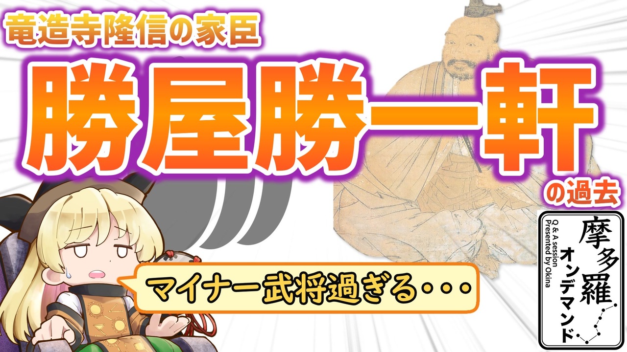 質問は下記URLから募集中!<br><a href="https://forms.gle/RDFBmdNcgcHAGGMQ8" target="_blank" rel="noopener nofollow">https://forms.gle/RDFBmdNcgcHAGGMQ8</a><br><br>初めましての人は初めまして、しかかくと申します。<br>この動画シリーズは皆様からの無茶ぶり(デマンド)に対し、できる限り答えていく新企画となります。質問の関係上、不確定な内容を含む場合もありますのでその点はご注意ください。<br><br>今回は龍造寺家臣・勝屋勝一軒についての考察になります。勝屋氏は元々大内家家臣だったと伝わっていますが、その実態については不明でした。今回はしかかくが確認できた限りで大内家家臣時代の勝屋一族について追跡します。<br><br>・参考文献<br>「大分県史料」「大内氏実録」「萩藩閥閲録」<br>長谷川博史 『大内氏の興亡と西日本社会』<br>池 享 『毛利領国の拡大と尼子・大友氏』<br><br><br>・使用楽曲<br>白鷺ゆっきー「大和に散らばる不思議な森」(「やまとごはん」より)<br>騒音のない音楽「人生、踊らにゃ」<br>騒音のない音楽「オーバーフロー」<br>騒音のない音楽「真夜中のショータイム」<br>白鷺ゆっきー「太子の里~たちばな香る飛鳥」(「やまとごはん」より)<br><br>針の音楽(白鷺ゆっきー):<a href="https://www.youtube.com/channel/UCk8CLZqSoSyYEHph6z3bnDg" target="_blank" rel="noopener nofollow">https://www.youtube.com/channel/UCk8CLZqSoSyYEHph6z3bnDg</a><br>騒音のない音楽:<a href="https://noiselessworld.net/" target="_blank" rel="noopener nofollow">https://noiselessworld.net/</a><br><br>・使用立ち絵<br>摩多羅隠岐奈<br>(原作:東方project、 絵:真田源次郎ベル助 様)<br><a href="https://twitter.com/berusuke_sanada" target="_blank" rel="noopener nofollow">https://twitter.com/berusuke_sanada</a><br><br>・地図:国土地理院<br>・他イラスト:イラストAC<br>・効果音:効果音ラボ<br><br>Youtube; <a href="https://www.youtube.com/channel/UCRyZjTeQgxd8iXcL2P8vwNA" target="_blank" rel="noopener nofollow">https://www.youtube.com/channel/UCRyZjTeQgxd8iXcL2P8vwNA</a><br>Twitter; <a href="https://twitter.com/SquareDeerHorn" target="_blank" rel="noopener nofollow">https://twitter.com/SquareDeerHorn</a>