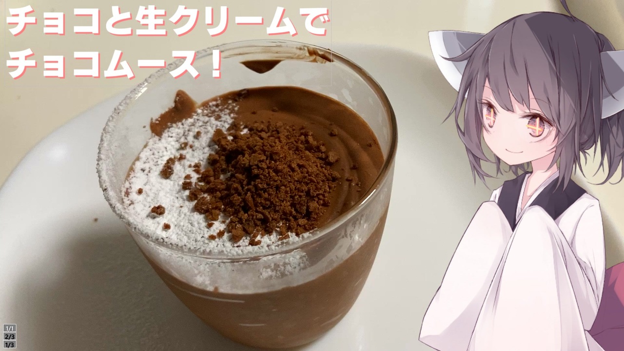 今回は溶かすだけで出来ちゃうチョコムース!<br>簡単なのに濃厚!是非お試しください!<br>【材料2個分くらい】<br>チョコ:100g<br>生クリーム:50ml+100ml<br><br>最近twitchでゲーム配信やってます!実はアバターオリジナル!<br>是非遊びに来てください!フォローもよろしくお願いします!<br><a href="https://www.twitch.tv/arch2801_1" target="_blank" rel="noopener nofollow">https://www.twitch.tv/arch2801_1</a><br><br>※YouTube側でも投稿しています!<br><a href="https://youtu.be/ICEJfBNg2tQ" target="_blank" rel="noopener nofollow">https://youtu.be/ICEJfBNg2tQ</a><br>そして是非チャンネル登録もお願いします!<br><a href="http://www.youtube.com/channel/UCgj7RfHha73UONAF-zJVidg?view_as=subscriber?sub_confirmation=1" target="_blank" rel="noopener nofollow">http://www.youtube.com/channel/UCgj7RfHha73UONAF-zJVidg?view_as=subscriber?sub_confirmation=1</a><br><br>立ち絵:桧野 拓海様<br><a href="https://seiga.nicovideo.jp/seiga/im10613314" target="_blank" rel="noopener nofollow">https://seiga.nicovideo.jp/seiga/im10613314</a><br>フリーBGM MunMun様<br><a href="https://musmus.main.jp/info.html" target="_blank" rel="noopener nofollow">https://musmus.main.jp/info.html</a><br>ミスキー:@arch2801 | Misskey.io<br>Twitter:<a href="https://twitter.com/arch2801_" target="_blank" rel="noopener nofollow">https://twitter.com/arch2801_</a>