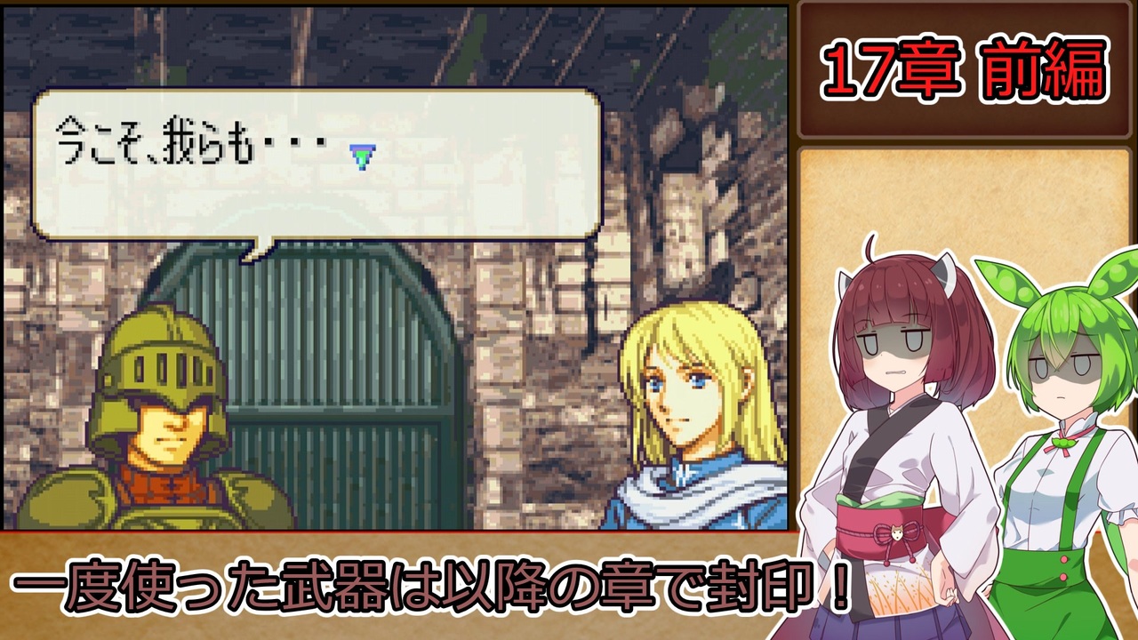 <span style="color: #85200c; font-size: 24px;"><strong><i>やることが多過ぎて30分に収まらなかったので分割です!</i></strong></span><br><br><strong>ルール1:一度使用した武器種は、以降の章で使用する事を禁止する。<br>ルール2:武器の使用の定義は『その武器を装備した状態で敵との戦闘が発生したタイミング』『その武器を売却して換金した場合』杖の場合は『対象に対して使用した時点(命中の可否は問わない)』とする。</strong><br><span style="color: #ff0000;"><strong>※同盟軍、演出による戦闘イベントでは使用した判定にはならないこととする。</strong></span><br><strong>ルール3:難易度はリン編ハード→ヘクトル編ハードとする。<br>ルール4:序章から終章まで外伝、異伝を含む全ての章を攻略し、仲間に出来るユニットは全員加入させ、生存させる。(序章と1章のみ同一の章として扱う)</strong><br><span style="color: #ff0000; font-size: 18px;"><strong>※バグ技禁止</strong></span><br><br>本動画のシリーズリスト【<a href="https://www.nicovideo.jp/series/406473" target="_blank" rel="noopener">series/406473</a>】<br>前作の同縛りプレイ【<a href="https://www.nicovideo.jp/series/316824" target="_blank" rel="noopener">series/316824</a>】<br>前:【<a href="https://www.nicovideo.jp/watch/sm42716880" class="watch">sm42716880</a>】次:【<a href="https://www.nicovideo.jp/watch/sm42767521" class="watch">sm42767521</a>】<br><br><strong>使用したソフト</strong><br>VOICEROID+東北きりたんEX<br>VOICEPEAK 東北きりたん<br>VOICEPEAK ずんだもん<br><strong>お借りした素材</strong><br>ニコニコモンズの皆様(コンテンツツリー参照)