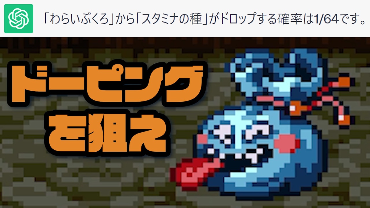 <br><strong>確率の海を越えていけ</strong><br><br><span style="color: #ff0000;">~基本ルール~-</span><br>①GPTは勇者を殺す為の行動を取る<br>②GPTは魔法使いのキャラとして作成し、その操作は<br>この全ルールを把握したchatGPTに都度聞いて任せる。<br>③GPTはわざと自殺・MP回復拒否するような行動は取れない<br>④GPTはパーティの1番前か1番後ろに配置させる<br>⑤GPTの持ち物や呪文はGPTの意思でしか移動・使用できない<br>⑥買い物時は全てプレイヤーの自由にできる<br>⑦リセットや、データを消去して1からやり直しても良い<br>⑧経験値を伴わない裏での金稼ぎ作業時のみルール全て例外とする<br><br><span style="color: #0000ff;">~禁じ手~</span><br>①操作キャラでGPTに危害を加える行為(危害=ダメージや悪い状態異常など)<br>※メダパニで混乱したせいで殴る、などは許される<br>②戦闘中にGPTが死んだ際に放置(その次のターン中に蘇生させなければいけない)<br>③戦闘開始or終了時にGPTが死んでいる<br>④GPTのMPが0か1の時にHP回復(蘇生も)を<br>GPT以外のメンバーに対して取る ※宿屋系はOK<br>⑤GPT以外がマホカンタ状態になる<br>⑥GPTがいない状態で戦闘を開始or続けるor勝利(バシルーラ等でいなくなったら逃げる行動のみ可)<br><br><span style="color: #38761d;">勇者が死ぬ or 上記を破る度にGPTに強制リセット。「リセット」をする度にGPTに1pt。<br>50pt貯まったらGPTの勝ち。企画終了。</span><br><br><strong>【次】 下のシリーズから飛んでね<br>【part1】 <a href="https://www.nicovideo.jp/watch/sm42595666" class="watch">sm42595666</a> 【投稿動画まとめ】 <a href="https://www.nicovideo.jp/mylist/32090282" target="_blank" rel="noopener">mylist/32090282</a></strong><br><br><span style="color: red;"><strong>▼投稿者情報▼</strong></span><br>【 Twitter 】 <a href="https://twitter.com/wakou2525" target="_blank" rel="noopener nofollow">https://twitter.com/wakou2525</a><br>【生放送コミュ】 co1668349<br>【意見・連絡先】 wakou2525otayori@yahoo.co.jp