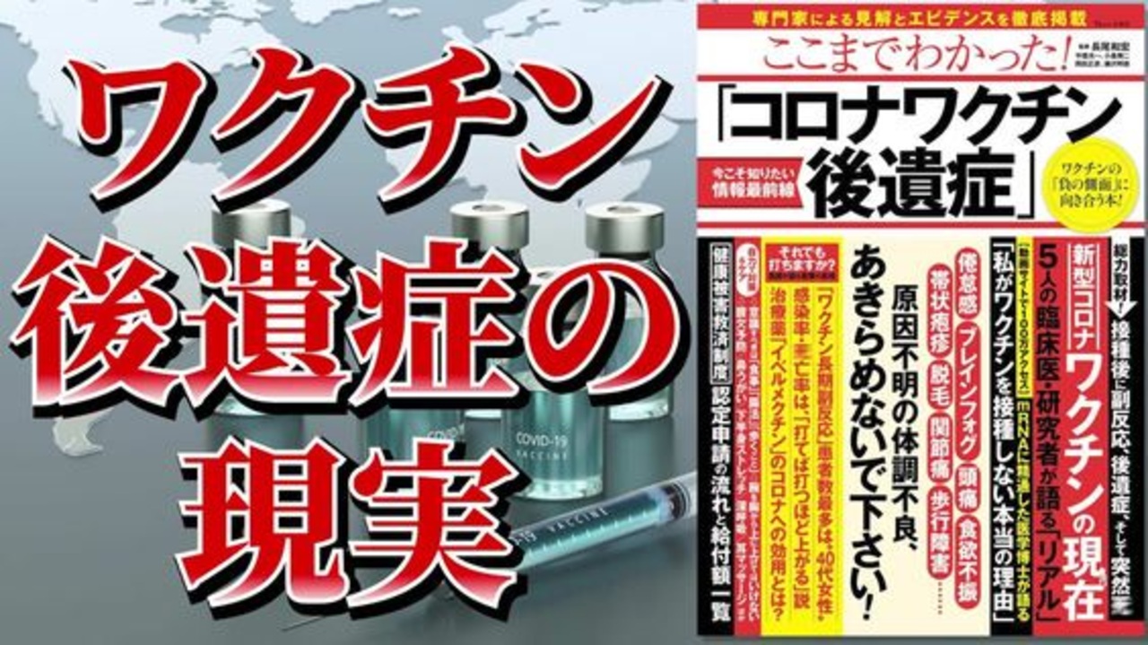 ◆動画のもくじ<br><br>0:00 オープニングムービー<br><br>0:55 動画のもくじ<br><br>1:23 第一章「新型コロナワクチンの現在」<br><br>3:55 第二章「コロナワクチン後遺症の実態」<br><br>8:35 第三章「コロナワクチン後遺症の改善法」<br><br>12:24 第四章「コロナワクチン後遺症対策」<br><br>16:05 書籍紹介<br><br>2023年3月から、「マスクの着用」の判断が原則私たち国民に委ねられ、5月からは、新型コロナの感染症法上の位置づけが5類に移行しました。<br>私たちは「日常」を取り戻しつつある一方、2021年に始まった新型コロナワクチンの接種には、様々な疑念がつきまとっています。<br>コロナワクチンを接種した後に原因不明の体調不良に悩まされている方々、接種直後に家族を亡くされ、悲しまれていらっしゃる方々は、確かに存在します。<br>その事実からは決して目を背けることはできません。<br><br>本誌では、一般に「ワクチン後遺症」と呼ばれる事象に真剣に向き合い、コロナやワクチンに精通した5人の医師に徹底取材。<br>それぞれの異なる見解や説、先生方の臨床・研究の成果を惜しまず公開しています。<br>今なお原因不明の体調不良に悩まされている方々には、是非この本を手に取って頂きたいと思います。<br>快方に向かう糸口が見つかるかもしれません。<br>これからのワクチン追加接種を悩まれている方々にも、選択のための有益な情報をお届けします。<br><br>※出典・本要約チャンネル様 <a href="https://www.youtube.com/@user-sf8vs7vs5k/videos" target="_blank" rel="noopener nofollow">https://www.youtube.com/@user-sf8vs7vs5k/videos</a>