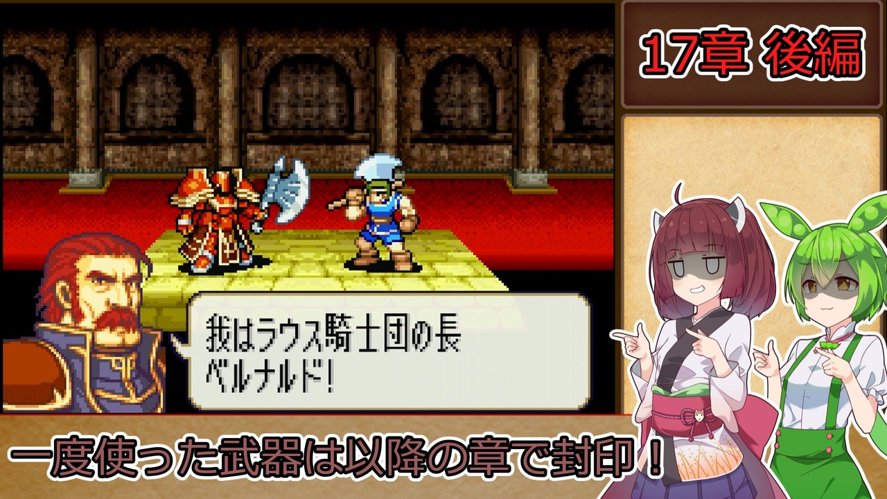 <span style="color: #85200c; font-size: 24px;"><strong><i>こんなこと平気でやれてた当時の私の精神状態はどうなってたんだ…</i></strong></span><br><br><strong>ルール1:一度使用した武器種は、以降の章で使用する事を禁止する。<br>ルール2:武器の使用の定義は『その武器を装備した状態で敵との戦闘が発生したタイミング』『その武器を売却して換金した場合』杖の場合は『対象に対して使用した時点(命中の可否は問わない)』とする。</strong><br><span style="color: #ff0000;"><strong>※同盟軍、演出による戦闘イベントでは使用した判定にはならないこととする。</strong></span><br><strong>ルール3:難易度はリン編ハード→ヘクトル編ハードとする。<br>ルール4:序章から終章まで外伝、異伝を含む全ての章を攻略し、仲間に出来るユニットは全員加入させ、生存させる。(序章と1章のみ同一の章として扱う)</strong><br><span style="color: #ff0000; font-size: 18px;"><strong>※バグ技禁止</strong></span><br><br>本動画のシリーズリスト【<a href="https://www.nicovideo.jp/series/406473" target="_blank" rel="noopener">series/406473</a>】<br>前作の同縛りプレイ【<a href="https://www.nicovideo.jp/series/316824" target="_blank" rel="noopener">series/316824</a>】<br>前:【<a href="https://www.nicovideo.jp/watch/sm42746445" class="watch">sm42746445</a>】次:【<a href="https://www.nicovideo.jp/watch/sm42800577" class="watch">sm42800577</a>】<br><br><strong>使用したソフト</strong><br>VOICEROID+東北きりたんEX<br>VOICEPEAK 東北きりたん<br>VOICEPEAK ずんだもん<br><strong>お借りした素材</strong><br>ニコニコモンズの皆様(コンテンツツリー参照)