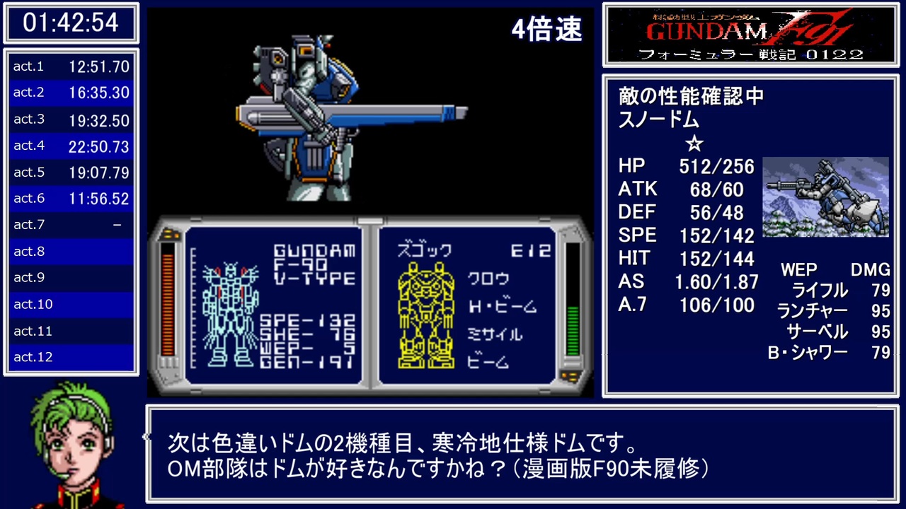 part4出来ました。<br>ACT.6~ACT.8まで<br>ねんがんのヴェスバーをてにいれたぞ!<br><br>part5→<a href="https://www.nicovideo.jp/watch/sm42788670" class="watch">sm42788670</a><br>part3→<a href="https://www.nicovideo.jp/watch/sm42746555" class="watch">sm42746555</a><br>part1→<a href="https://www.nicovideo.jp/watch/sm42729685" class="watch">sm42729685</a><br>※タイム再計測により総タイムに変更がありました。23/9/26<br><br>記録更新しました:<a href="https://www.nicovideo.jp/series/492029" target="_blank" rel="noopener">series/492029</a><br>別の配置の攻略はこちら→<a href="https://www.nicovideo.jp/series/435916" target="_blank" rel="noopener">series/435916</a><br><br>自作攻略本(仮)↓ <br><a href="https://docs.google.com/spreadsheets/d/1DQnb7GurKi1y6yCNLNoHER9v3d-p6vZwB3bxt_ykGj8" target="_blank" rel="noopener nofollow">https://docs.google.com/spreadsheets/d/1DQnb7GurKi1y6yCNLNoHER9v3d-p6vZwB3bxt_ykGj8</a><br>※最新情報のため動画の解説と異なることがあります。<br><br>再生、コメント、マイリスト、フォロー、いいね、広告ありがとうございます。<br>※エミュレータによるプレイのため参考記録です。