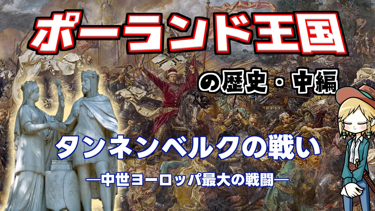 タンネンベルクの戦い、別称グルンヴァルトの戦い。<br>11歳にしてポーランド王国の(女)王となったヤドヴィガの数奇な運命からのドイツ騎士団との戦い。<br><br>ポーランドの歴史の最大のハイライトとドラマです。<br>もう東欧の道路とは呼ばせない。<br><br>前編はこちら →<a href="https://www.nicovideo.jp/watch/sm42717594?ref=garage_share_other" target="_blank" rel="noopener nofollow">https://www.nicovideo.jp/watch/sm42717594?ref=garage_share_other</a><br>限定動画あり。モンド・ヒストリカの離宮 → <a href="https://ch.nicovideo.jp/mond-historica" target="_blank" rel="noopener nofollow">https://ch.nicovideo.jp/mond-historica</a><br><br><br><br>今回の参考文献:<br>山内進(2011)『北の十字軍 「ヨーロッパ」の北方拡大』講談社<br>伊東一郎 編(2023)『スラヴ民族の歴史』山川出版社 <br>渡辺克善(2017)『物語 ポーランドの歴史』中央公論社<br><br>その他 Wikipediaなど<br><br><br>twitter | <a href="https://twitter.com/Yukkuri_mond" target="_blank" rel="noopener nofollow">https://twitter.com/Yukkuri_mond</a><br><br><br />━━━━━━━━━━━━━━━━━━━━━<br><br>この動画はクリエイティブ・コモンズ継承(CC-BY-SA)ライセンスの素材を使用して制作しています。(<a href="https://creativecommons.org/licenses/by-sa/4.0/)" target="_blank" rel="noopener nofollow">https://creativecommons.org/licenses/by-sa/4.0/)</a><br>規約に基づき、この動画もCC-BY-SA 4.0 のもとで公開します。<br><br>投稿者共通情報☆彡<br><br>BGM, SE:ニコニ・コモンズ様<br><a href="http://commons.nicovideo.jp/" target="_blank" rel="noopener nofollow">http://commons.nicovideo.jp/</a><br>魔王魂様<br><a href="https://maoudamashii.jokersounds.com/" target="_blank" rel="noopener nofollow">https://maoudamashii.jokersounds.com/</a><br>Audiostock様<br><a href="https://audiostock.jp/" target="_blank" rel="noopener nofollow">https://audiostock.jp/</a><br><br>立ち絵 霊夢・魔理沙(黒子式):nicotalk様<br><a href="http://www.nicotalk.com/charasozai.html" target="_blank" rel="noopener nofollow">http://www.nicotalk.com/charasozai.html</a><br><br>立ち絵 パトラ、マリー、アン、メアリ:ライフライフ様<br><a href="https://0801lifelife.tumblr.com/" target="_blank" rel="noopener nofollow">https://0801lifelife.tumblr.com/</a><br><br>使用ツール1:ゆっくりムービーメーカー4<br><a href="https://manjubox.net/ymm4/" target="_blank" rel="noopener nofollow">https://manjubox.net/ymm4/</a><br><br>使用ツール2:AviUtl<br><a href="http://spring-fragrance.mints.ne.jp/aviutl/" target="_blank" rel="noopener nofollow">http://spring-fragrance.mints.ne.jp/aviutl/</a><br><br>各時代の地図 : World History Maps & Timelines <br><a href="http://geacron.com/home-en/" target="_blank" rel="noopener nofollow">http://geacron.com/home-en/</a><br><br>ゆっくりボイスについて:AquesTalkライセンス取得済み<br><br>キャラクターボイス<br>アン・ボニー:羽ノ華(A.I.VOICE)<br>メアリ・リード:琴葉 葵(A.I.VOICE)<br>クレオパトラ:結月ゆかり(VOICEROID2)<br>マリー‐アントワネット:東北きりたん (VOICEROID EX)<br>その他キャラ:青山龍星(A.I.VOICE)、伊織弓鶴(A.I.VOICE2)、栗田まろん(A.I.VOICE)、宮舞モカ(VOICEPEAK)、フリモメン(VOICEPEAK)<br><br><br><br>その他フリー素材ご提供元の皆様に圧倒的感謝<br>