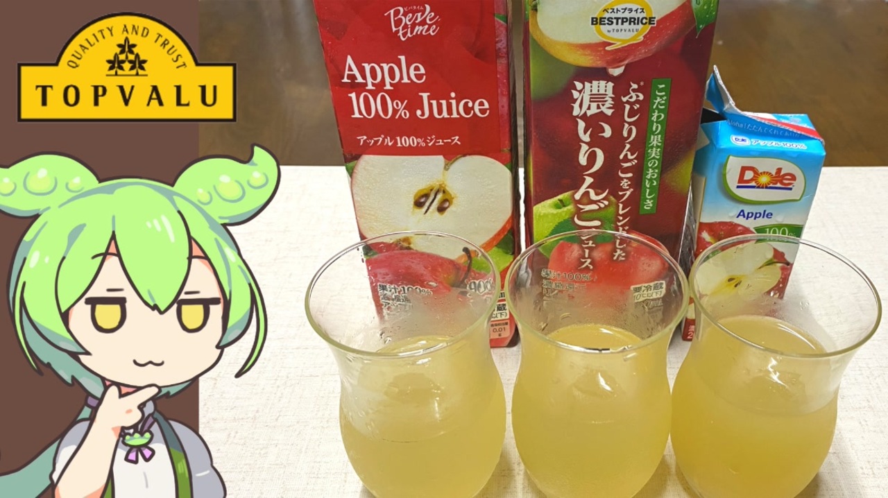 今回の隠れトプバは「ビバタイム」<br>コーヒーや緑茶などドリンク類についているブランド名です。<br><br><br>【参考】<br>ビバタイム アップル100%ジュース(トップバリュ)<br><a href="https://www.topvalu.net/items/detail/4549414454758/" target="_blank" rel="noopener nofollow">https://www.topvalu.net/items/detail/4549414454758/</a><br>(ふじりんごをブレンドした)濃いりんごジュース(トップバリュ)<br><a href="https://www.topvalu.net/items/detail/4549414445787/" target="_blank" rel="noopener nofollow">https://www.topvalu.net/items/detail/4549414445787/</a><br>Doleアップル 100%(雪印メグミルク)<br><a href="https://www.meg-snow.com/products/detail.php?p=dole_apple200" target="_blank" rel="noopener nofollow">https://www.meg-snow.com/products/detail.php?p=dole_apple200</a><br>濃縮還元とストレートジュースの違いって?製造方法の違いや特徴をご紹介(早和果樹園)<br><a href="https://sowakajuen.com/articles/mikan-products/differences-between-mikan-juice-from-concentrate-and-straight-juice/" target="_blank" rel="noopener nofollow">https://sowakajuen.com/articles/mikan-products/differences-between-mikan-juice-from-concentrate-and-straight-juice/</a><br>果汁100%ジュース「濃縮還元」「ストレート」の違いを解説(株式会社 堀他)<br><a href="https://www.e-horita.co.jp/column/column_20200908_4" target="_blank" rel="noopener nofollow">https://www.e-horita.co.jp/column/column_20200908_4</a><br>データで見るりんご:国内・世界の生産量(青森県庁)<br><a href="https://www.pref.aomori.lg.jp/soshiki/nourin/ringo/ringo-data023.html" target="_blank" rel="noopener nofollow">https://www.pref.aomori.lg.jp/soshiki/nourin/ringo/ringo-data023.html</a><br><br><br>【使用した素材】(※敬称略)<br>(合成音声)VOICEVOX/ずんだもん/四国めたん/<br><a href="https://voicevox.hiroshiba.jp/" target="_blank" rel="noopener nofollow">https://voicevox.hiroshiba.jp/</a><br>(立ち絵)坂本アヒル<br><a href="https://seiga.nicovideo.jp/seiga/im10788496" target="_blank" rel="noopener">im10788496</a>/<a href="https://seiga.nicovideo.jp/seiga/im10791276" target="_blank" rel="noopener">im10791276</a><br>(楽曲)甘茶の音楽工房/「楽しい麦畑」<br><a href="https://amachamusic.chagasi.com/" target="_blank" rel="noopener nofollow">https://amachamusic.chagasi.com/</a>