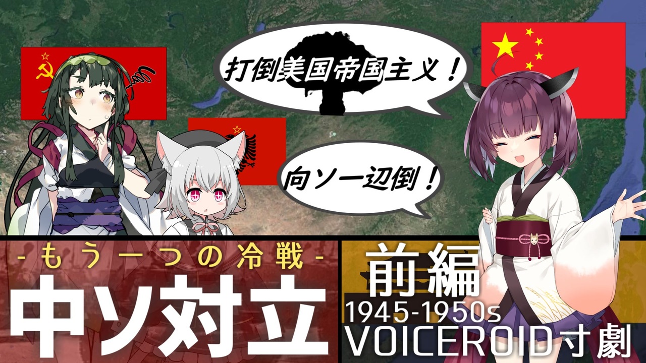 <s>VIC3とHoi4</s>リアルが忙しく中々動画が投稿できずにいましたが久しぶりの投稿です。<br>後編は10月中には...<br>【1/4追記】登録し忘れていた親作品を登録しました。<br>【動画内の配役】<br>ナレーション:琴葉葵:VOICEROID+EX<br>ソビエト連邦:東北ずん子:VOICEROID+EX<br>中華人民共和国:東北きりたん:VOICEROID+EX<br>朝鮮民主主義人民共和国:琴葉茜:VOICEROID+EX<br>アルバニア:小夜/SAYO:VOICEVOX<br>日本共産党:紲星あかり:VOICEROID2<br>アメリカ合衆国:結月ゆかり:VOICEROID2<br>中華民国:音街ウナ:VOICEROID2<br><br>【参考文献】<br>アジア冷戦史/下斗米 伸夫<br>中国とソ連/毛里 和子<br>中華人民共和国史 新版/天児 慧<br>日本共産党-「革命」を夢見た100年/中北 浩爾 <br>【Twitter】<br>@santai_san_1991<br><br>【お借りした素材】<br>・立ち絵<br>琴葉姉妹 - むにさが 様<br>東北きりたん - 紀常 様<br>音街ウナ - ユメノオワリ 様<br>東北ずん子 - からい 様<br>結月ゆかり - からい 様<br>小夜 - moiky 様<br>・地図<br>Google Earth<br>・音楽<br>効果音ラボ 様<br>無料効果音で遊ぼう! 様<br>