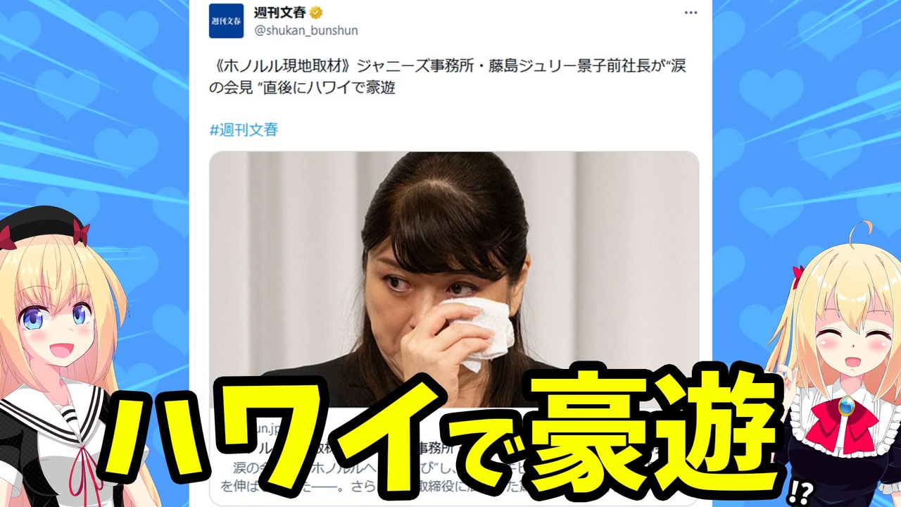 【ユーチューブで見る】<a href="https://youtu.be/JbmZQjeXI_M" target="_blank" rel="noopener nofollow">https://youtu.be/JbmZQjeXI_M</a><br>【引用元】 <a href="https://twitter.com/shukan_bunshun/status/1704330469389779180" target="_blank" rel="noopener nofollow">https://twitter.com/shukan_bunshun/status/1704330469389779180</a> <br>《ホノルル現地取材》ジャニーズ事務所・藤島ジュリー景子前社長が“涙の会見 ”直後にハワイで豪遊 <a href="https://bunshun.jp/denshiban/articles/b6929" target="_blank" rel="noopener nofollow">https://bunshun.jp/denshiban/articles/b6929</a><br />【サブチャンネル】<a href="https://www.youtube.com/channel/UCNeJoEWLt0jeZ0n5lDFalJg?sub_confirmation=1" target="_blank" rel="noopener nofollow">https://www.youtube.com/channel/UCNeJoEWLt0jeZ0n5lDFalJg?sub_confirmation=1</a> <br><br>【素材など、よくお世話になっているサイト(敬称略)】<br>BGMer <a href="https://bgmer.net" target="_blank" rel="noopener nofollow">https://bgmer.net</a><br>いらすとや <a href="https://www.irasutoya.com/" target="_blank" rel="noopener nofollow">https://www.irasutoya.com/</a><br>イラストAC <a href="https://www.ac-illust.com/" target="_blank" rel="noopener nofollow">https://www.ac-illust.com/</a><br>photoAC <a href="https://www.photo-ac.com/" target="_blank" rel="noopener nofollow">https://www.photo-ac.com/</a><br>効果音ラボ <a href="https://soundeffect-lab.info/" target="_blank" rel="noopener nofollow">https://soundeffect-lab.info/</a><br>DOVA-SYNDROME <a href="https://dova-s.jp/" target="_blank" rel="noopener nofollow">https://dova-s.jp/</a><br>甘茶の音楽工房 <a href="http://amachamusic.chagasi.com/index.html" target="_blank" rel="noopener nofollow">http://amachamusic.chagasi.com/index.html</a><br>魔王魂 <a href="https://maoudamashii.jokersounds.com/" target="_blank" rel="noopener nofollow">https://maoudamashii.jokersounds.com/</a><br>ニコニ・コモンズ <a href="https://commons.nicovideo.jp/" target="_blank" rel="noopener nofollow">https://commons.nicovideo.jp/</a><br><br>★BGM★<br>Happy Smile Paura - Music by Mixtery<br><a href="https://mix-mastery.stores.jp" target="_blank" rel="noopener nofollow">https://mix-mastery.stores.jp</a><br> ※本動画ではパウラちゃんねる専用BGMを使用しています。 <br><br>#パウラちゃんねる <br><br>当チャンネルはAmazon.co.jpを宣伝しリンクすることによって紹介料を獲得できる手段を提供することを目的に設定されたアフィリエイトプログラムである、Amazonアソシエイト・プログラムの参加者です。