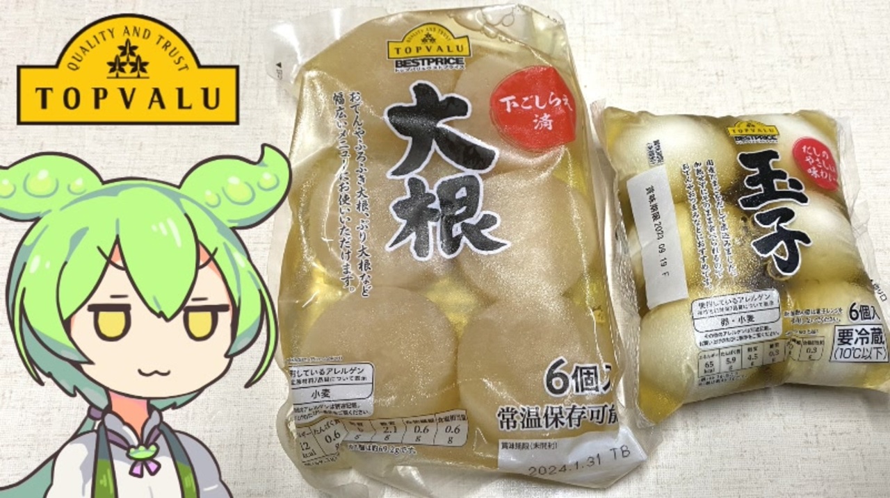 おでんや煮物に使える大根やたまごです。<br><br><br>【参考】<br>下ごしらえ済大根(トップバリュ)<br><a href="https://www.topvalu.net/items/detail/4549414204643/" target="_blank" rel="noopener nofollow">https://www.topvalu.net/items/detail/4549414204643/</a><br>だしのやさしい味わい玉子(トップバリュ)<br><a href="https://www.topvalu.net/items/detail/4549414089004/" target="_blank" rel="noopener nofollow">https://www.topvalu.net/items/detail/4549414089004/</a><br>セブンイレブンのおでんのたまご<br><a href="https://www.sej.co.jp/products/a/item/120069/" target="_blank" rel="noopener nofollow">https://www.sej.co.jp/products/a/item/120069/</a><br><br><br><br>【使用した素材】(※敬称略)<br>(合成音声)VOICEVOX/ずんだもん/四国めたん/<br><a href="https://voicevox.hiroshiba.jp/" target="_blank" rel="noopener nofollow">https://voicevox.hiroshiba.jp/</a><br>(立ち絵)坂本アヒル<br><a href="https://seiga.nicovideo.jp/seiga/im10788496" target="_blank" rel="noopener">im10788496</a>/<a href="https://seiga.nicovideo.jp/seiga/im10791276" target="_blank" rel="noopener">im10791276</a><br>(楽曲)甘茶の音楽工房/「楽しい麦畑」「お城の舞踏会」<br><a href="https://amachamusic.chagasi.com/" target="_blank" rel="noopener nofollow">https://amachamusic.chagasi.com/</a>