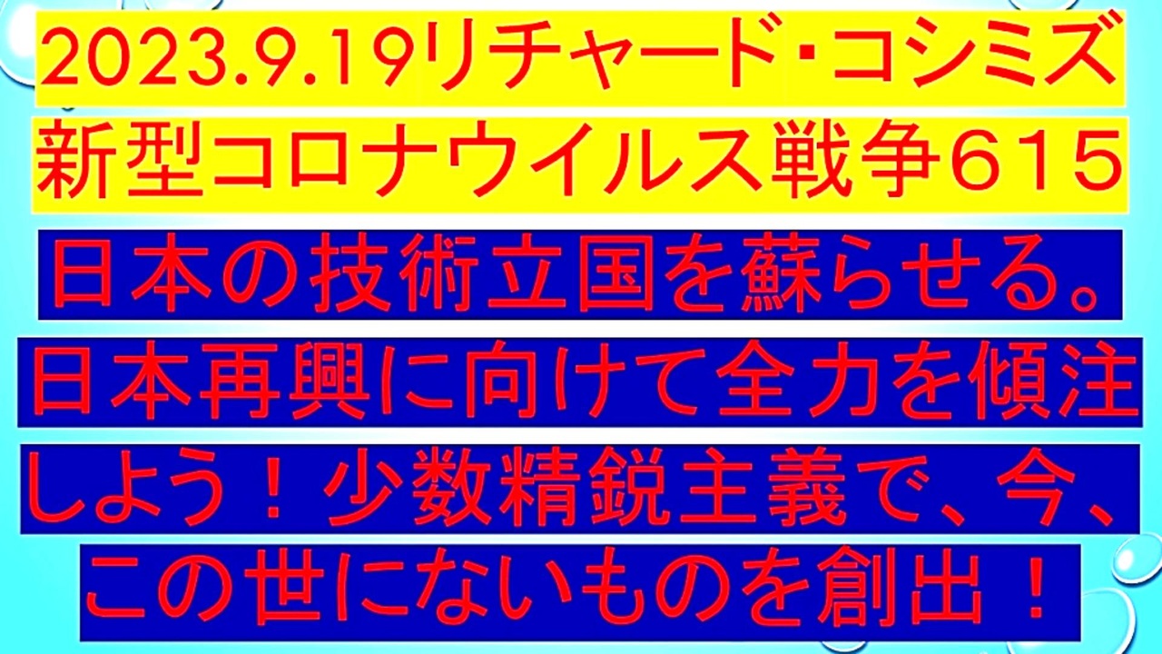 <span style="color: #cc4125;"><strong>「 テーマ : 新型コロナウイルス戦争 615 」</strong></span><br><br><span style="color: #ff0000;"><strong>「『 日本 』の『 技術立国 』を『 蘇らせる 』。『 日本再興 』に向けて、『 全力 』を『 傾注 』しよう!<br> 『 少数精鋭主義 』で、今、『 この世にないもの 』を『 創出 』! 」</strong></span><br><br><span style="color: #0000ff;"><strong>「『 イベルメクチン・アビガン・その他コロナ対策 』について、ご意見をお寄せ下さい! 」<br><br> ◐ E-mail:richardkoshimizu@gmail.com</strong></span><br><br><strong>◐「クリエイター・サポート」・「ニコニ広告」・「フォロー」等、ご協力の程宜しくお願い致します。RK</strong><br><br><span style="color: #38761d;"><strong>◐ リチャード・コシミズ 講演会 公式 動画ギャラリー</strong></span><br> <span style="color: #38761d;"><strong><a href="http://www.t-sskk.com/richardkoshimizu/video-gallery/index.html" target="_blank" rel="noopener nofollow">http://www.t-sskk.com/richardkoshimizu/video-gallery/index.html</a><br><br>◐ リチャード・コシミズ 講演会『 ニコニコ生放送「 LIVE 」』</strong></span><br> <span style="color: #38761d;"><strong><a href="https://bit.ly/3Bx8F5w" target="_blank" rel="noopener nofollow">https://bit.ly/3Bx8F5w</a><br><br>◐ リチャード・コシミズ『 ニコニコ チャンネル 』</strong></span><br> <span style="color: #38761d;"><strong><a href="https://ch.nicovideo.jp/richardkoshimizu" target="_blank" rel="noopener nofollow">https://ch.nicovideo.jp/richardkoshimizu</a><br><br>◐ リチャード・コシミズ 公式 ブログ</strong></span><br> <span style="color: #38761d;"><strong><a href="http://08054623210.jugem.jp/" target="_blank" rel="noopener nofollow">http://08054623210.jugem.jp/</a><br><br>◐ リチャード・コシミズ 公式 ホームページ</strong></span><br> <span style="color: #38761d;"><strong><a href="http://richardkoshimizu.boo.jp/" target="_blank" rel="noopener nofollow">http://richardkoshimizu.boo.jp/</a></strong></span><br>