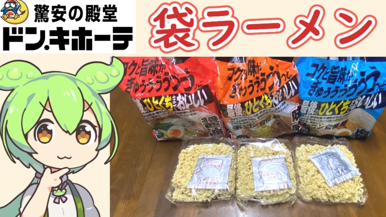 ドン・キホーテの袋ラーメンですがドンキのプライベートブランド「情熱価格」のロゴがありません。<br>見た目はドンキ製品ですが情熱価格ではない謎の商品、味はどうでしょうか。<br><br><br>【参考】<br>ドン・キホーテ<br><a href="https://www.donki.com/" target="_blank" rel="noopener nofollow">https://www.donki.com/</a><br>株式会社つばめ食品<br><a href="https://www.tsubaro.jp/" target="_blank" rel="noopener nofollow">https://www.tsubaro.jp/</a><br>オールタイムヌードル すっきりした味わい しょうゆラーメン(トップバリュ)<br><a href="https://www.topvalu.net/items/detail/4549414433845/" target="_blank" rel="noopener nofollow">https://www.topvalu.net/items/detail/4549414433845/</a><br><br><br>【使用した素材】(※敬称略)<br>(合成音声)VOICEVOX/ずんだもん/四国めたん/<br><a href="https://voicevox.hiroshiba.jp/" target="_blank" rel="noopener nofollow">https://voicevox.hiroshiba.jp/</a><br>(立ち絵)坂本アヒル<br><a href="https://seiga.nicovideo.jp/seiga/im10788496" target="_blank" rel="noopener">im10788496</a>/<a href="https://seiga.nicovideo.jp/seiga/im10791276" target="_blank" rel="noopener">im10791276</a><br>(楽曲)甘茶の音楽工房/「楽しい麦畑」「フルーツパフェ」「お城の舞踏会」<br><a href="https://amachamusic.chagasi.com/" target="_blank" rel="noopener nofollow">https://amachamusic.chagasi.com/</a><br><br><br>【関連動画】<br>トップバリュの「袋ラーメン(しょうゆ味)」<br><a href="https://www.youtube.com/watch?v=5aAmL4ydaQE&t=15s" target="_blank" rel="noopener nofollow">https://www.youtube.com/watch?v=5aAmL4ydaQE&t=15s</a>