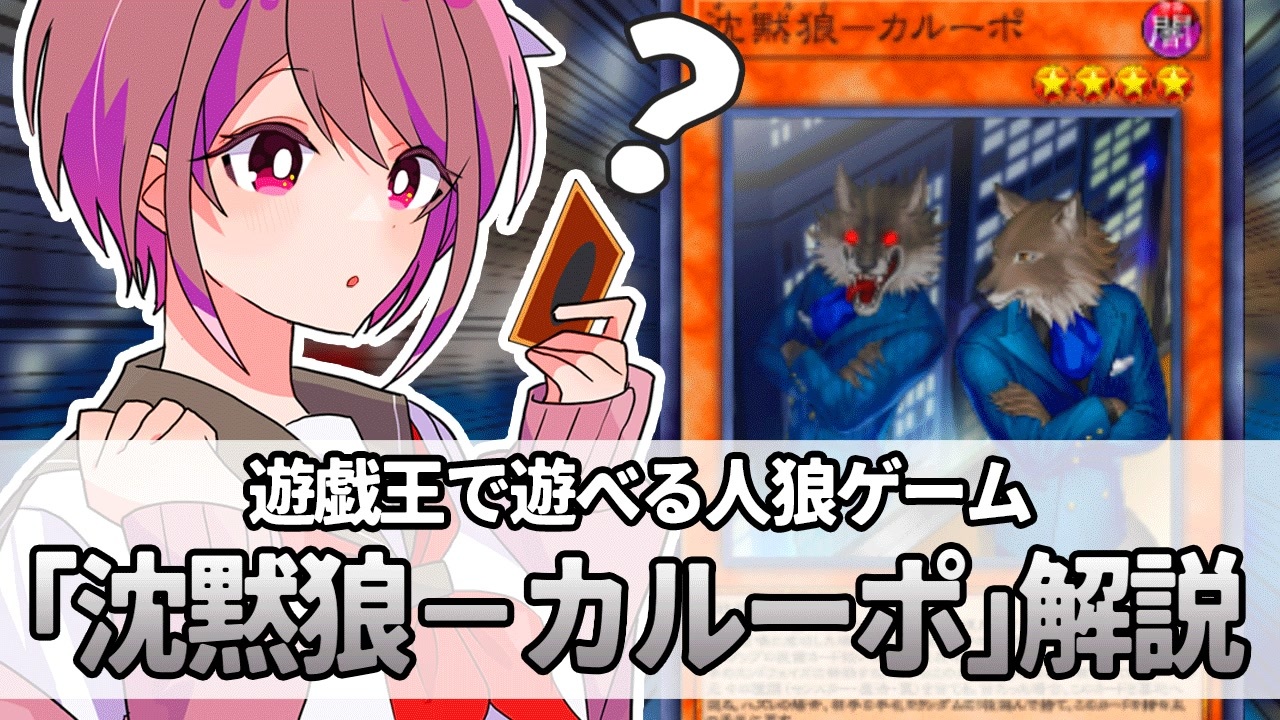 遊戯王で人狼ゲームが楽しめる個性的なノーマルレアカード、沈黙狼-カルーポの紹介です。<br>ノーマルレアシリーズ全部紹介したい~~~~~<br><br>【余談】<br>このカードは以前新しく始めた「ひとくちカード解説」で投稿するために、サーキュラーと共に並行して進めていたシリーズですが、どうしても1分以内で収めるのは無理だったので通常のシリーズにしました。(投稿ペースが早いのはそういう理由)<br>内容を1分で要約するスキルがないっぽいので、あのシリーズはサーキュラーが最初で最後になるかも・・・。<br /><br>【素材・制作者様】<br><a href="https://kahaduxxxe.booth.pm/" target="_blank" rel="noopener nofollow">https://kahaduxxxe.booth.pm/</a><br><a href="https://twitter.com/akr_1020" target="_blank" rel="noopener nofollow">https://twitter.com/akr_1020</a><br>※許可を得て使用しております。<br><br>【Twitter】<br><a href="https://twitter.com/pi_ni_ki" target="_blank" rel="noopener nofollow">https://twitter.com/pi_ni_ki</a><br><br>【支援絵アルバム】<br><a href="https://note.com/pix989/n/nf5aab604fd77" target="_blank" rel="noopener nofollow">https://note.com/pix989/n/nf5aab604fd77</a>