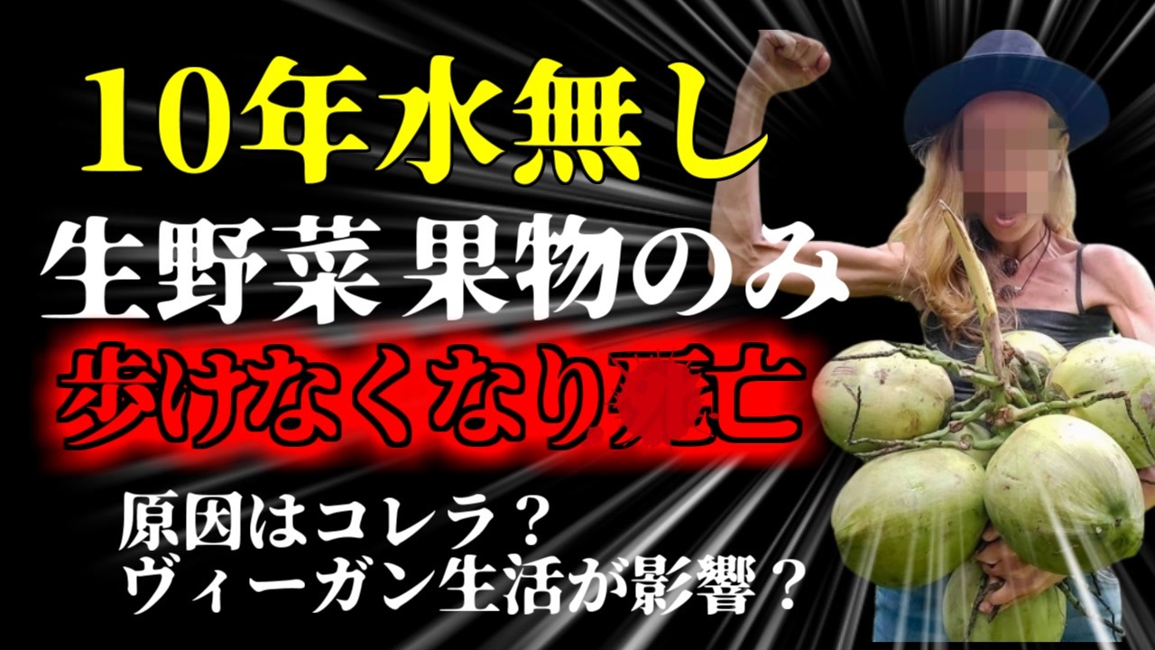<a href="#" class="seekTime" data-seekTime="00:00" onclick="seekNicoPlayer('#00:00'); return false;">#00:00</a> 冒頭挨拶<br><a href="#" class="seekTime" data-seekTime="00:21" onclick="seekNicoPlayer('#00:21'); return false;">#00:21</a> 視聴上の注意<br><a href="#" class="seekTime" data-seekTime="00:48" onclick="seekNicoPlayer('#00:48'); return false;">#00:48</a> 本編開始<br><a href="#" class="seekTime" data-seekTime="00:51" onclick="seekNicoPlayer('#00:51'); return false;">#00:51</a> マレーシアの病院で亡くなった女性「Aさん」(39)<br><a href="#" class="seekTime" data-seekTime="1:27" onclick="seekNicoPlayer('#1:27'); return false;">#1:27</a> 「ヴィーガニズム」<br><a href="#" class="seekTime" data-seekTime="2:47" onclick="seekNicoPlayer('#2:47'); return false;">#2:47</a> Aさんが実践していた「ローヴィーガン」<br><a href="#" class="seekTime" data-seekTime="4:00" onclick="seekNicoPlayer('#4:00'); return false;">#4:00</a> ハマる切っ掛けになった出来事<br><a href="#" class="seekTime" data-seekTime="6:03" onclick="seekNicoPlayer('#6:03'); return false;">#6:03</a> 心配する声<br><a href="#" class="seekTime" data-seekTime="7:54" onclick="seekNicoPlayer('#7:54'); return false;">#7:54</a> 友人らの指摘<br><a href="#" class="seekTime" data-seekTime="8:47" onclick="seekNicoPlayer('#8:47'); return false;">#8:47</a> 母親の証言<br><a href="#" class="seekTime" data-seekTime="9:31" onclick="seekNicoPlayer('#9:31'); return false;">#9:31</a> 食事療法は気を付けて行おう<br><br>今回紹介するのは、リクエストがありました、とある女性の話です。<br>ロシア出身の女性「Aさん」が旅行先のマレーシアの病院で7月、静かに息を引き取りました。<br>彼女は10年以上前から、「ヴィーガン」として生活、活動を行っており、この旅行は東南アジア各国を渡り、「ローヴィーガン」を語るためのものでした。<br>彼女が行っていたこのローヴィーガンは、生の野菜や果物、種子などだけで生活するという、非常に特殊な食事法でしたが、彼女は十年以上前からこの生活を続け、なんと一切の水を口にせず、果物などの水分のみで生活していたというのです。<br>この生活に目覚めてから、彼女自身は体長が良くなったと主張していましたが、Aさんの体は年々筋肉が落ち、やせ細っていったため、親族や周りの友人らは心配し、医療機関を受診するように説得を試みましたが、彼女は聞く耳を持ちませんでした。彼女はマレーシアの病院に入院し、治療を受けていましたが、自力で歩くのも難しく、階段を一段上がるのに、数分以上の時間を要するなど、その衰弱は体に顕著に表れていました。<br>彼女が亡くなった原因は公表されておらず、ヴィーガン生活が直接的な原因になったかどうかは不明であり、母親の話によれば、衰弱に加えてなんらかの感染症(コレラ等)にかかっていたとのことでした。<br>明確な原因が不明であったことから、「ヴィーガン生活が原因」「食べていた物に含まれた化学物質が悪い」「コレラが原因であってヴィーガンは関係ない」など、様々な見解があったそうです。<br><br><br>引用・出展・参考文献<br>Wikipedia ヴィーガン<br><a href="https://ishort.ink/zAGW" target="_blank" rel="noopener nofollow">https://ishort.ink/zAGW</a><br>Instagram<br><a href="https://www.instagram.com/p/CT9k-ArqKP_/" target="_blank" rel="noopener nofollow">https://www.instagram.com/p/CT9k-ArqKP_/</a><br>NDTV WORLD<br><a href="https://ishort.ink/rTUQ" target="_blank" rel="noopener nofollow">https://ishort.ink/rTUQ</a><br>NewYoukPost<br><a href="https://ishort.ink/UoTq" target="_blank" rel="noopener nofollow">https://ishort.ink/UoTq</a><br>
