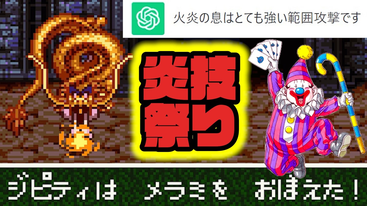 <br><strong>ちょっと…色々とヤバイんですけど…?</strong><br><br><span style="color: #ff0000;">~基本ルール~-</span><br>①GPTは勇者を殺す為の行動を取る<br>②GPTは魔法使いのキャラとして作成し、その操作は<br>この全ルールを把握したchatGPTに都度聞いて任せる。<br>③GPTはわざと自殺・MP回復拒否するような行動は取れない<br>④GPTはパーティの1番前か1番後ろに配置させる<br>⑤GPTの持ち物や呪文はGPTの意思でしか移動・使用できない<br>⑥買い物時は全てプレイヤーの自由にできる<br>⑦リセットや、データを消去して1からやり直しても良い<br>⑧経験値を伴わない裏での金稼ぎ作業時のみルール全て例外とする<br><br><span style="color: #0000ff;">~禁じ手~</span><br>①操作キャラでGPTに危害を加える行為(危害=ダメージや悪い状態異常など)<br>※メダパニで混乱したせいで殴る、などは許される<br>②戦闘中にGPTが死んだ際に放置(その次のターン中に蘇生させなければいけない)<br>③戦闘開始or終了時にGPTが死んでいる<br>④GPTのMPが0か1の時にHP回復の選択(蘇生も)を<br>GPT以外のメンバーに対して取る ※宿屋系はOK<br>⑤GPT以外がマホカンタ状態になる<br>⑥GPTがいない状態で戦闘を開始or続けるor勝利(バシルーラ等でいなくなったら逃げる行動のみ可)<br><br><span style="color: #38761d;">勇者が死ぬ or 上記を破る度にGPTに強制リセット。「リセット」をする度にGPTに1pt。<br>50pt貯まったらGPTの勝ち。企画終了。</span><br><br><strong>【次】 下のシリーズから飛んでね<br>【part1】 <a href="https://www.nicovideo.jp/watch/sm42595666" class="watch">sm42595666</a> 【投稿動画まとめ】 <a href="https://www.nicovideo.jp/mylist/32090282" target="_blank" rel="noopener">mylist/32090282</a></strong><br><br><span style="color: red;"><strong>▼投稿者情報▼</strong></span><br>【 Twitter 】 <a href="https://twitter.com/wakou2525" target="_blank" rel="noopener nofollow">https://twitter.com/wakou2525</a><br>【生放送コミュ】 co1668349<br>【意見・連絡先】 wakou2525otayori@yahoo.co.jp