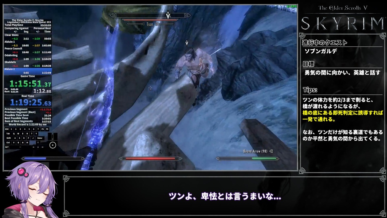 メインクエストを<strong>最高難易度でグリッチを使わずに</strong>攻略するRTAです。<br>旧世界記録にあたる自身の1時間20分16秒(LRT*)にて解説を行います。<br>RTAでの記録は1時間23分59秒です。<br>*LRT = Load Removed Time<br><br><strong>◯カテゴリー:</strong> Legendary Glitchless Main Quest<br><br><strong>◯計測方法</strong><br>Livesplitを使用し、ロード時間を除いた時間(LRT方式)で計測する。<br>計測開始: ヘルゲンの斬首台から操作が可能になってから<br>計測終了: アルドゥインを倒した瞬間<br><br><strong>◯ランキング表</strong> <span style="color: #b7b7b7; font-size: 10px;">(走者4人...)</span><br><a href="https://www.speedrun.com/skyrim?h=Legendary_Glitchless_Main_Quest&x=824eg1nk" target="_blank" rel="noopener nofollow">https://www.speedrun.com/skyrim?h=Legendary_Glitchless_Main_Quest&x=824eg1nk</a><br><br><strong>◯レギュレーション</strong><br>最高難易度固定、グリッチ使用禁止、mod使用禁止<br>・詳細なルール<br><a href="https://www.speedrun.com/skyrim?h=Legendary_Glitchless_Main_Quest&rules=game&x=824eg1nk" target="_blank" rel="noopener nofollow">https://www.speedrun.com/skyrim?h=Legendary_Glitchless_Main_Quest&rules=game&x=824eg1nk</a><br><a href="https://www.speedrun.com/skyrim?h=Legendary_Glitchless_Main_Quest&rules=category&x=824eg1nk" target="_blank" rel="noopener nofollow">https://www.speedrun.com/skyrim?h=Legendary_Glitchless_Main_Quest&rules=category&x=824eg1nk</a><br><br><strong>◯変更可能なini設定</strong><br><a href="https://www.speedrun.com/skyrim/guides/xl8wz" target="_blank" rel="noopener nofollow">https://www.speedrun.com/skyrim/guides/xl8wz</a><br><br>◯<strong>チャート原案 by nucular</strong><br><a href="https://www.speedrun.com/skyrim/guides/m7j0y" target="_blank" rel="noopener nofollow">https://www.speedrun.com/skyrim/guides/m7j0y</a><br><br>Part 1: <a href="https://www.nicovideo.jp/watch/sm42634973" class="watch">sm42634973</a><br>Part 2: <a href="https://www.nicovideo.jp/watch/sm42736470" class="watch">sm42736470</a><br>Part 3: <a href="https://www.nicovideo.jp/watch/sm42784983" class="watch">sm42784983</a><br><br>YouTube版(総集編): <a href="https://youtu.be/b0QQBpMrKPE" target="_blank" rel="noopener nofollow">https://youtu.be/b0QQBpMrKPE</a><br><br>無編集版: <a href="https://www.youtube.com/watch?v=aZ_qn2s3ylA&t=473s" target="_blank" rel="noopener nofollow">https://www.youtube.com/watch?v=aZ_qn2s3ylA&t=473s</a><br><br>最低難易度グリッチレス: <a href="https://www.nicovideo.jp/watch/sm42107712" class="watch">sm42107712</a>