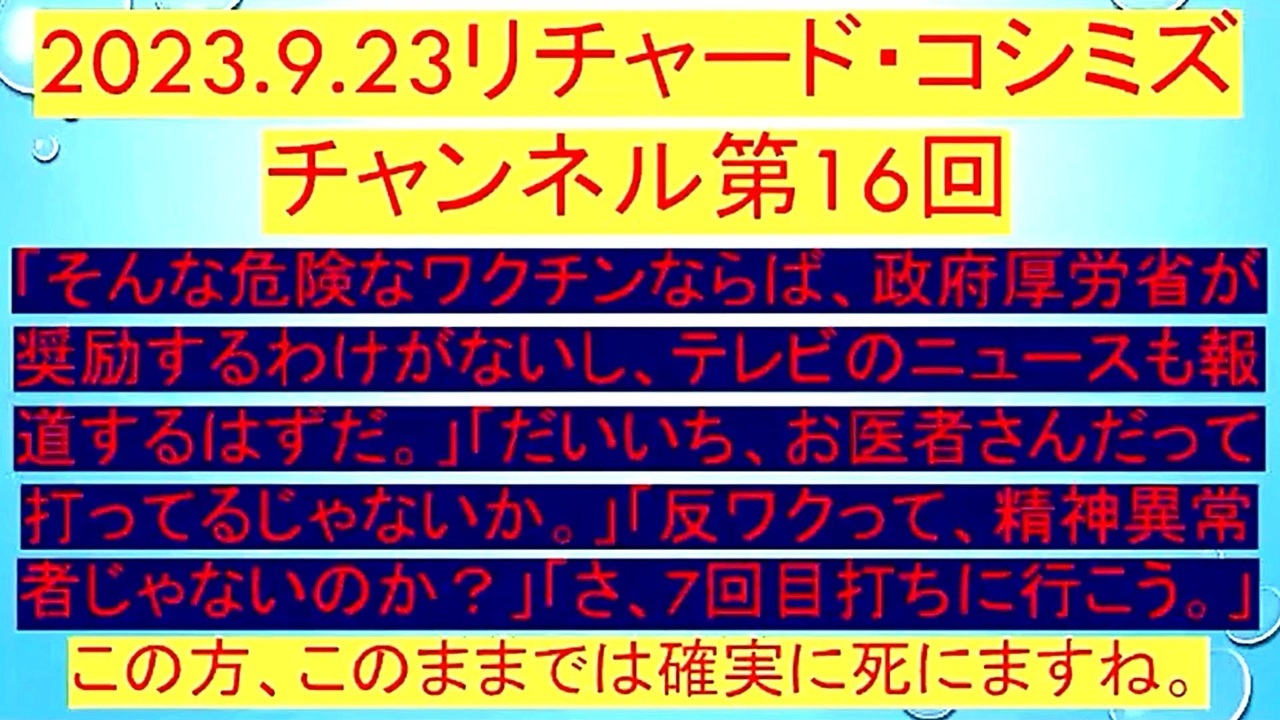 <span style="color: #ff0000;"><strong>「『 そんな危険なワクチン 』ならば、『 政府厚労省が奨励するわけがない 』し、『 テレビのニュースも<br> 報道するはずだ 』。『 だいいち、お医者さんだって打ってるじゃないか 』。『 反ワクって、精神異常者<br> じゃないのか? 』『 さ、7回目打ちに行こう 』。『 この方、このままでは確実に死にますね 』」</strong></span><br><br><span style="color: #0000ff;"><strong>「『 イベルメクチン・アビガン・その他コロナ対策 』について、ご意見をお寄せ下さい! 」<br><br> ◐ E-mail:richardkoshimizu@gmail.com</strong></span><br><br><strong>◐「クリエイター・サポート」・「ニコニ広告」・「フォロー」等、ご協力の程宜しくお願い致します。RK</strong><br><br><span style="color: #38761d;"><strong>◐ リチャード・コシミズ 講演会 公式 動画ギャラリー</strong></span><br> <span style="color: #38761d;"><strong><a href="http://www.t-sskk.com/richardkoshimizu/video-gallery/index.html" target="_blank" rel="noopener nofollow">http://www.t-sskk.com/richardkoshimizu/video-gallery/index.html</a><br><br>◐ リチャード・コシミズ 講演会 『 ニコニコ生放送「 LIVE 」』</strong></span><br> <span style="color: #38761d;"><strong><a href="https://bit.ly/3Bx8F5w" target="_blank" rel="noopener nofollow">https://bit.ly/3Bx8F5w</a><br><br>◐ リチャード・コシミズ 『 ニコニコ チャンネル 』</strong></span><br> <span style="color: #38761d;"><strong><a href="https://ch.nicovideo.jp/richardkoshimizu" target="_blank" rel="noopener nofollow">https://ch.nicovideo.jp/richardkoshimizu</a><br><br>◐ リチャード・コシミズ 公式 ブログ</strong></span><br> <span style="color: #38761d;"><strong><a href="http://08054623210.jugem.jp/" target="_blank" rel="noopener nofollow">http://08054623210.jugem.jp/</a><br><br><br>◐ リチャード・コシミズ 公式 ホームページ</strong></span><br> <span style="color: #38761d;"><strong><a href="http://richardkoshimizu.boo.jp/" target="_blank" rel="noopener nofollow">http://richardkoshimizu.boo.jp/</a></strong></span>