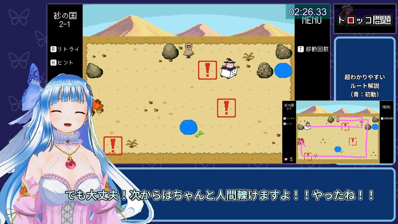 トロッコ問題 Steamストアページ:<a href="https://store.steampowered.com/app/2344990/_/" target="_blank" rel="noopener nofollow">https://store.steampowered.com/app/2344990/_/</a><br>※パズルの解法とストーリーのネタバレ注意です。<br><br><strong><u>レギュレーション<br>救済者(Savior)エンドを達成する<br>バグの使用不可<br>計測区間:はじめからを選択~メインメニューに戻った瞬間</u></strong><br><br>タイマー付けただけ版→<a href="https://youtu.be/m1v0bUT35oc" target="_blank" rel="noopener nofollow">https://youtu.be/m1v0bUT35oc</a><br><br>前→<a href="https://www.nicovideo.jp/watch/sm42618659" class="watch">sm42618659</a><br>次→<a href="https://www.nicovideo.jp/watch/sm42815592" class="watch">sm42815592</a><br>RTAマイリス→<a href="https://www.nicovideo.jp/mylist/74656323" target="_blank" rel="noopener">mylist/74656323</a><br><br><u>使用させていただいた素材・ソフト等</u><br>AviUtl<br>A.I.VOICE 琴葉葵<br>COM3D2(VAS使用)<br><br>声の出演<br>ナレーター:COEIROINK アルマちゃん<br>リリィ:VOICEVOX 四国めたん<br>ツキハナ:COEIROINK Rinne<br>シトラ:VOICEVOX もち子さん(CV明日葉よもぎ)<br><br>その他お借りした素材はコンテンツツリーをご覧ください。<br /><br>ついった(旧Twitter):<a href="https://twitter.com/tsubame_sizimi" target="_blank" rel="noopener nofollow">https://twitter.com/tsubame_sizimi</a>