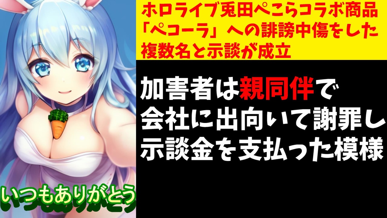 2023年9月26日、ホロライブに所属するVTuber、兎田ぺこらさんのコラボグッズ、ペコーラに対して誹謗中傷を行っていた複数名との示談が成立したとの発表がありました。<br><br>引用<br><a href="https://twitter.com/icrea_goods/status/1706549190057443757" target="_blank" rel="noopener nofollow">https://twitter.com/icrea_goods/status/1706549190057443757</a><br><a href="https://twitter.com/nemokaro893/status/1705895567149412585" target="_blank" rel="noopener nofollow">https://twitter.com/nemokaro893/status/1705895567149412585</a><br><br>Youtube <a href="https://www.youtube.com/@V_Virgin_Mary" target="_blank" rel="noopener nofollow">https://www.youtube.com/@V_Virgin_Mary</a><br>twitter <a href="https://twitter.com/V_Virgin_Mary" target="_blank" rel="noopener nofollow">https://twitter.com/V_Virgin_Mary</a><br><br>使用素材<br>高品質なフリー動画素材 - Pixabay <a href="https://pixabay.com/ja/videos" target="_blank" rel="noopener nofollow">https://pixabay.com/ja/videos</a>