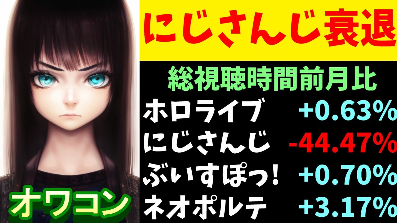 2023年9月21日にVtuber専門の統計サイト「VSTATS」さんが公開したにじさんじの視聴時間が前月比で44%も減ってるという衝撃的なデータを公開され話題になっています。<br><br>引用<br>終電□ Vtuber 2023年9月各種統計データ(9/20暫定値) (9/21 1時記事)<br><a href="https://blog.vstats.jp/archives/22250987.html" target="_blank" rel="noopener nofollow">https://blog.vstats.jp/archives/22250987.html</a><br><br>Youtube <a href="https://www.youtube.com/@V_Virgin_Mary" target="_blank" rel="noopener nofollow">https://www.youtube.com/@V_Virgin_Mary</a><br>twitter <a href="https://twitter.com/V_Virgin_Mary" target="_blank" rel="noopener nofollow">https://twitter.com/V_Virgin_Mary</a><br><br>使用素材<br>高品質なフリー動画素材 - Pixabay <a href="https://pixabay.com/ja/videos" target="_blank" rel="noopener nofollow">https://pixabay.com/ja/videos</a>
