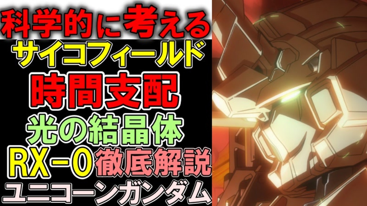 【ガンダムUC】RX-0ユニコーンガンダムを科学的に考察しよう。サイコフィールド、サイコフレーム、サイコシャードなどなどを徹底解説【ガンダム解説】<br><br>ガンダムUCに登場する主役機、RX-0ユニコーンガンダムの性能と想定された戦い方などを解説しながら、サイコフレームが光る理由、サイコシャードなどを科学的に解説、考察していきます。<br><br>今回は考察がほとんどです。<br>※時間巻き戻しについての詳細は、ナラティブかフェネクス辺りでやる予定です。<br><br>ミノフスキー粒子が便利過ぎる気がしますが、便利にするために作られた設定なので徹底的に使い倒すのが一番良い気がしました。<br>ちなみに電波が目に見えない理由は、可視光よりもエネルギーが小さいからだそうなので、ミノフスキー粒子が共振してエネルギー的なものを得たら目に見えるのかなと思いました。<br><br>現在連載中の小説はこちら(コメディ寄り、色々統合整備中):<br>異世界アイドル革命!死に戻り悪役令嬢は閃いた『こいつら全員アイドルにしてしまおう!』<br><a href="https://kakuyomu.jp/works/16817330662598051943" target="_blank" rel="noopener nofollow">https://kakuyomu.jp/works/16817330662598051943</a><br><br>質問、などありましたらこちらにも<br><a href="https://twitter.com/@i4S0LHspdgzBTor" target="_blank" rel="noopener nofollow">https://twitter.com/@i4S0LHspdgzBTor</a><br><br>清見元康名義でカクヨム、小説家になろう、たいあっぷなどに投稿しています。<br>もし良ければ応援お願いしますm(_ _)m<br><a href="https://kakuyomu.jp/users/GariD/works" target="_blank" rel="noopener nofollow">https://kakuyomu.jp/users/GariD/works</a><br><a href="https://mypage.syosetu.com/953815/" target="_blank" rel="noopener nofollow">https://mypage.syosetu.com/953815/</a><br><a href="https://tieupnovels.com/user/GariGari" target="_blank" rel="noopener nofollow">https://tieupnovels.com/user/GariGari</a><br><br>以前の作品(短編シリアス):<br>転生した厄災の大魔女はやがて聖女と呼ばれる<br><a href="https://ncode.syosetu.com/n0827ha/" target="_blank" rel="noopener nofollow">https://ncode.syosetu.com/n0827ha/</a><br><br>A.I.VOICE:結月ゆかり<br>VOICEVOX:ずんだもん<br><br>使用させていただいたずんだもん:<br>ずんだもん mini Deluxe(立ち絵) ver1.2<br><a href="https://seiga.nicovideo.jp/seiga/im10794509" target="_blank" rel="noopener nofollow">https://seiga.nicovideo.jp/seiga/im10794509</a><br><br>いつも広告、コメントありがとうございます。<br>励みになりますm(_ _)m<br>