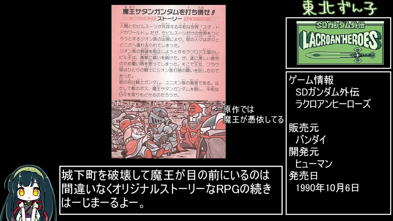 <span style="color: #111111; font-size: 14px;">GBソフト「SDガンダム外伝 ラクロアンヒーローズ」のバグ技使用なしのRTAのPART2です。</span><br>ナイトサザビー~サザビーロードまでサザビーがたっぷりだもん。<br>無音区間を削除した修正版を挙げたので3秒くらいコメントがずれているかもしれません。大変申し訳ありません。<br><br>訂正情報<br>・冒頭無音区間が入っていたので削除<br>・誤字、誤用の修正(指摘兄貴ありがとう!)<br>・ステータスの補正、攻略順の表記(魔導士の塔の後にジオン砦)、税に関する部分<br>・末尾の動画が動いていた部分<br><br>無編集版<br><a href="https://www.youtube.com/watch?v=FcvbYwZcRxw" target="_blank" rel="noopener nofollow">https://www.youtube.com/watch?v=FcvbYwZcRxw</a><br><br>使用ソフト<br>・VOICEROID2(VOICEROID EX+ 東北ずん子)<br>・AVIUtil<br><br>Q:投稿被っちゃったと?<br>A:単発かつソロ実況で使えそうな動画がこれしかなかった(なぜ被ったのかコレガワカラナイ)<br><br>Q:自分の仕事を自分語りして、大丈夫なんすかねこの人<br>A:精華町で公表されている研究の話であって私の仕事じゃないよ?<br><br><span style="font-size: 14px;">投稿リンク → </span><a href="https://www.nicovideo.jp/series/432347" target="_blank" rel="noopener">series/432347</a><br>PART1リンク<span style="font-size: 14px;">→</span><span style="color: #006699; font-size: 14px;"><a href="https://www.nicovideo.jp/mylist/62480170" target="_blank" rel="noopener">mylist/62480170</a></span><br><br>計測区間:「NEWGAME」選択から「-おわり-」表示後キャラクターがフェードアウトするまで<br>プレイ環境:スーパーファミコン(後期生産版)+スーパーゲームボーイ2<br>コントローラ:連射なし<br>録画環境 :GV-USB2<br><br><a target="_blank" href="https://qa.nicovideo.jp/faq/show/19424?site_domain=default" style="font-size: 13px;color: #657586; text-decoration: underline; line-height: 1.4">この動画は投稿者によって修正されました</a>