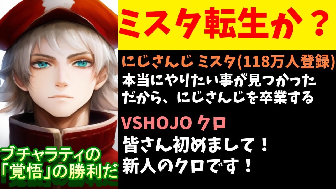 2023年10月1日、VTuberグループVSHOJOよりケーナイン・クロ(K9KURO)さんがデビューしたのですが、彼が2023年8月27日ににじさんじENを卒業したミスタ・リアス(Mysta Rias)さんの転生だとして国内海外ともに話題になっています。<br><br>引用<br><a href="https://twitter.com/K9_KURO/status/1708310004502307328" target="_blank" rel="noopener nofollow">https://twitter.com/K9_KURO/status/1708310004502307328</a><br><br>Youtube <a href="https://www.youtube.com/@V_Virgin_Mary" target="_blank" rel="noopener nofollow">https://www.youtube.com/@V_Virgin_Mary</a><br>twitter <a href="https://twitter.com/V_Virgin_Mary" target="_blank" rel="noopener nofollow">https://twitter.com/V_Virgin_Mary</a><br><br>使用素材<br>高品質なフリー動画素材 - Pixabay <a href="https://pixabay.com/ja/videos" target="_blank" rel="noopener nofollow">https://pixabay.com/ja/videos</a>