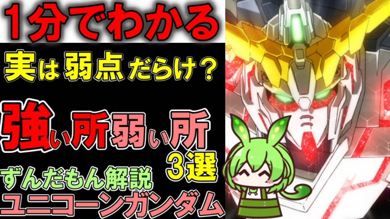 この動画は、You Tubeのショート動画をそのまま転載したものです。<br><br>考えてみたら本編の時点でマリーダさんとクシャトリヤがいなければローゼン・ズールに完封されてましたね・・・。<br>そして最大可動の時間はビグザム以下。<br>誰が乗るかで性能変わる。<br>物凄い強いけど軍にはいらないってMS筆頭な気がします。<br><br>本編の解説動画はこちら。<br>【ガンダムUC】RX-0ユニコーンガンダムを科学的に考察しよう。サイコフィールド、サイコフレーム、サイコシャードなどなどを徹底解説【ガンダム解説】<br><a href="https://www.nicovideo.jp/watch/sm42823050" target="_blank" rel="noopener nofollow">https://www.nicovideo.jp/watch/sm42823050</a><br><br>質問、などありましたらこちらにも<br><a href="https://twitter.com/@i4S0LHspdgzBTor" target="_blank" rel="noopener nofollow">https://twitter.com/@i4S0LHspdgzBTor</a><br><br>清見元康名義でカクヨムなどに小説を投稿しています! 面白ければブクマ、あるいは厳し目の評価など貰えると嬉しいです。<br>異世界アイドル革命!死に戻り悪役令嬢は閃いた『こいつら全員アイドルにしてしまおう!』<br><a href="https://kakuyomu.jp/works/16817330662598051943" target="_blank" rel="noopener nofollow">https://kakuyomu.jp/works/16817330662598051943</a><br><br>以前の作品(短編シリアス):<br>転生した厄災の大魔女はやがて聖女と呼ばれる<br><a href="https://ncode.syosetu.com/n0827ha/" target="_blank" rel="noopener nofollow">https://ncode.syosetu.com/n0827ha/</a><br><br>VOICEVOX:ずんだもん<br><br>使用させていただいたずんだもん:<br>ずんだもん mini Deluxe(立ち絵) ver1.2<br><a href="https://seiga.nicovideo.jp/seiga/im10794509" target="_blank" rel="noopener nofollow">https://seiga.nicovideo.jp/seiga/im10794509</a><br><br>いつも広告、コメントありがとうございます。<br>励みになりますm(_ _)m<br>