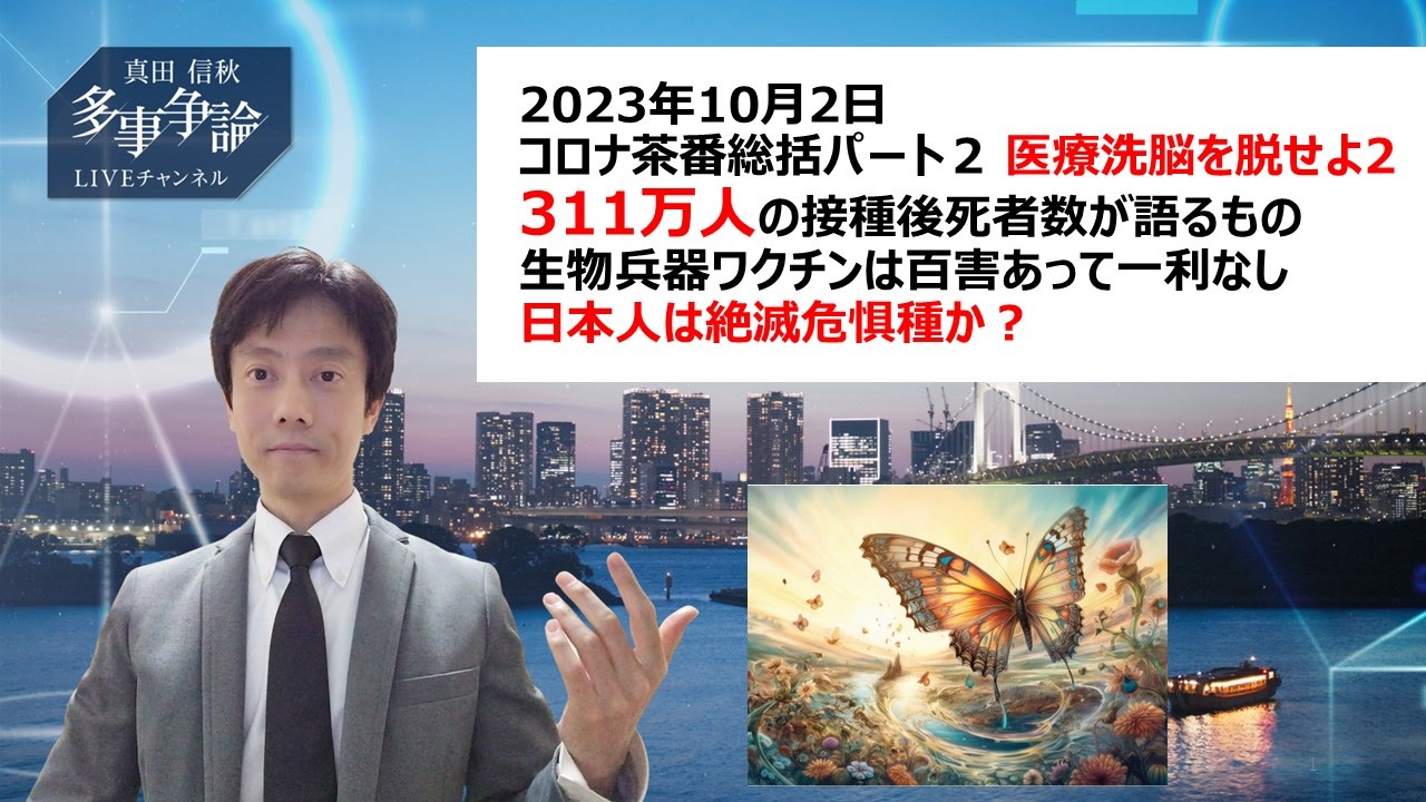 23年6月22日に、医療洗脳を脱せよとして、ひとり単独生放送をさせて頂きました。<br>今回は、そのパート2として、311万人の接種後死者数の補足を兼ねつつ、各種の<br>資料の更新部分も公開させて頂きたいと存じます。<br><br>日本国独立宣言論 私は独立を宣言する! 真田信秋<br><a href="https://amzn.to/3D90lwx" target="_blank" rel="noopener nofollow">https://amzn.to/3D90lwx</a><br> <br>主権者命令書 主権破壊を許すな 売国傀儡日本政府を解体せよ<br><a href="https://amzn.to/49z51b5" target="_blank" rel="noopener nofollow">https://amzn.to/49z51b5</a><br> <br>マトリックス洗脳社会 グローバル企業ディストピア<br><a href="https://amzn.to/4g2YmZg" target="_blank" rel="noopener nofollow">https://amzn.to/4g2YmZg</a><br><br>メディア廃棄宣言 高橋清隆さん<br><a href="https://amzn.to/3BfdYKg" target="_blank" rel="noopener nofollow">https://amzn.to/3BfdYKg</a><br><br>元文部省委員×元農林水産大臣が語る「ゲノム編集食品」と「RNAコロナワクチン」の危険性と危惧 (苫米地英人×山田正彦・遺伝子組み換え技術問題×自由貿易条約問題~抜粋~)<br><a href="https://www.youtube.com/watch?v=UmqRgt5QNOQ&t=1379s" target="_blank" rel="noopener nofollow">https://www.youtube.com/watch?v=UmqRgt5QNOQ&t=1379s</a><br>
