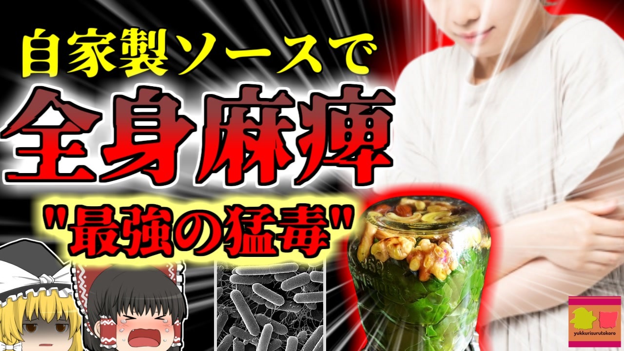 <a href="#" class="seekTime" data-seekTime="00:00" onclick="seekNicoPlayer('#00:00'); return false;">#00:00</a> 冒頭挨拶<br><a href="#" class="seekTime" data-seekTime="00:47" onclick="seekNicoPlayer('#00:47'); return false;">#00:47</a> 視聴上の注意<br><a href="#" class="seekTime" data-seekTime="1:47" onclick="seekNicoPlayer('#1:47'); return false;">#1:47</a> 本編開始<br><a href="#" class="seekTime" data-seekTime="2:31" onclick="seekNicoPlayer('#2:31'); return false;">#2:31</a> 帰宅後に食材を保管したAさん<br><a href="#" class="seekTime" data-seekTime="3:08" onclick="seekNicoPlayer('#3:08'); return false;">#3:08</a> 一か月後<br><a href="#" class="seekTime" data-seekTime="3:42" onclick="seekNicoPlayer('#3:42'); return false;">#3:42</a> 異変<br><a href="#" class="seekTime" data-seekTime="4:48" onclick="seekNicoPlayer('#4:48'); return false;">#4:48</a> 駐車場で助けを呼んだAさん<br><a href="#" class="seekTime" data-seekTime="6:05" onclick="seekNicoPlayer('#6:05'); return false;">#6:05</a> 原因<br><a href="#" class="seekTime" data-seekTime="7:13" onclick="seekNicoPlayer('#7:13'); return false;">#7:13</a> 「猛毒の夕食」<br><a href="#" class="seekTime" data-seekTime="8:27" onclick="seekNicoPlayer('#8:27'); return false;">#8:27</a> ボツリヌス菌<br><a href="#" class="seekTime" data-seekTime="10:42" onclick="seekNicoPlayer('#10:42'); return false;">#10:42</a> 長い入院生活と後遺症<br><a href="#" class="seekTime" data-seekTime="12:19" onclick="seekNicoPlayer('#12:19'); return false;">#12:19</a> 予防方法<br><br><br>今回紹介するのは、以前リクエストがありました、とある食中毒事例の一つです。<br>ブラジル某所に暮らす女性「Aさん」はこの日、以前貯蔵庫に保管していた、瓶詰のバジルソースを使った夕食を食べ、就寝していましたが、翌日目が覚めると、なんと12時間近く眠ってしまっており、口の中が痺れ、激しい腹痛がするなど、謎の症状に襲われました。恐怖したAさんは、すぐに車に乗り込み、自宅から約20kmのところにある病院へと急ぎました。<br>しかし、彼女の症状は到着したころには重症化し、駐車場に車を停めた直後、彼女は麻痺によって体に力が入らず、動けなくなってしまいました。<br>それでもなんとかドアを開け、車の外に脱出した彼女は大声で叫び、助けを呼びました。そして彼女は看護師に発見され、医師の診察を受けました。<br>すると、彼女は"自然界最強の猛毒"といわれている毒素に侵されていることが判明。原因の調査が行われましたが・・・<br><br>引用・出展・参考文献<br>東京都保険医療局 食品衛生の窓<br><a href="https://ishort.ink/uTRC" target="_blank" rel="noopener nofollow">https://ishort.ink/uTRC</a><br>奈良県奈良市HP ボツリヌスにご注意<br><a href="https://ishort.ink/kBSx" target="_blank" rel="noopener nofollow">https://ishort.ink/kBSx</a><br>名古屋学芸大学 管理栄養学部<br><a href="https://ishort.ink/BCsq" target="_blank" rel="noopener nofollow">https://ishort.ink/BCsq</a><br><br><br><br><br><br><br><br />※この動画は過去の事件を知り、現在でも同じことが発生する危険性を再認識、関与しないように促すための動画であり、視聴者を扇動、動揺を誘うためのコンテンツではありません。<br><br>ご要望にお応えして、メンバーシップの開設を行いました。<br>下記URLからも登録可能ですので、ご興味がある方は是非ご参加ください。<br><a href="https://www.youtube.com/channel/UCcT5a1J7XJW7CLYI2RKl4pw/join" target="_blank" rel="noopener nofollow">https://www.youtube.com/channel/UCcT5a1J7XJW7CLYI2RKl4pw/join</a><br><br><br>Twitter<br>→<a href="https://twitter.com/yukkurisurutoko" target="_blank" rel="noopener nofollow">https://twitter.com/yukkurisurutoko</a><br><br>取り急ぎ、簡易的にですがマイリストを作りました。<br>【ゆっくり解説】事故・事件関係紹介リスト <br><a href="https://www.nicovideo.jp/mylist/71034319" target="_blank" rel="noopener nofollow">https://www.nicovideo.jp/mylist/71034319</a><br>【ゆっくり解説】放射線系事故<br><a href="https://www.nicovideo.jp/mylist/71034368" target="_blank" rel="noopener nofollow">https://www.nicovideo.jp/mylist/71034368</a><br>【ゆっくり解説】鉄道系事故・事件関連<br><a href="https://www.nicovideo.jp/mylist/71034379" target="_blank" rel="noopener nofollow">https://www.nicovideo.jp/mylist/71034379</a>
